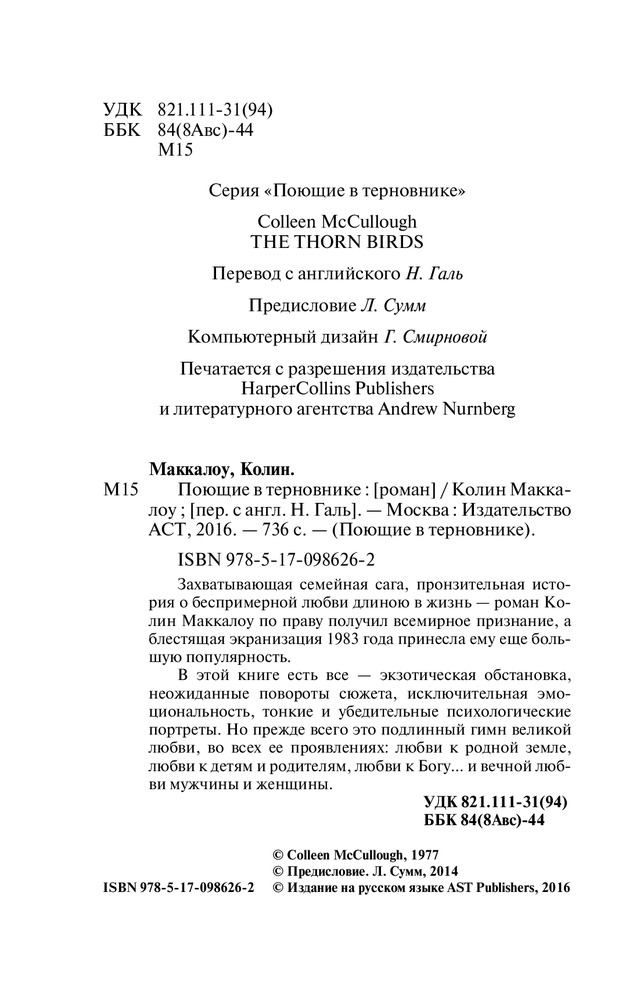 Поющие в терновникеВ данный момент этот товар отсутствует в продаже. Возможно, у нас найдется аналогичный или похожий товар здесь. Серия: Поющие в терновнике Захватывающая семейная сага, пронзительная история о беспримерной любви длиною в жизнь — роман Колин Маккалоу по праву получил всемирное признание, а блестящая экранизация 1983 года принесла ему еще большую популярность. |