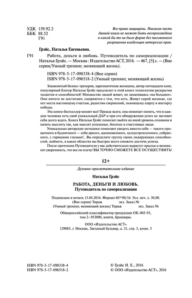 Работа, деньги и любовь. Путеводитель по самореализацииВ данный момент этот товар отсутствует в продаже. Возможно, у нас найдется аналогичный или похожий товар здесь. Серия: Умный тренинг, меняющий жизнь Знаменитый бизнес-тренер, харизматичная женщина, автор 15 книг, популярный блогер Наталья Грэйс предлагает в этой книге технологию раскрытия талантов и способностей! Множество людей живет, не замахиваясь «на большее». Они ничего не достигают, смиряются с тем, что есть. Живут серой жизнью, где нет места настоящему счастью, радостям свершений, пьянящему азарту и восторгу победы. |