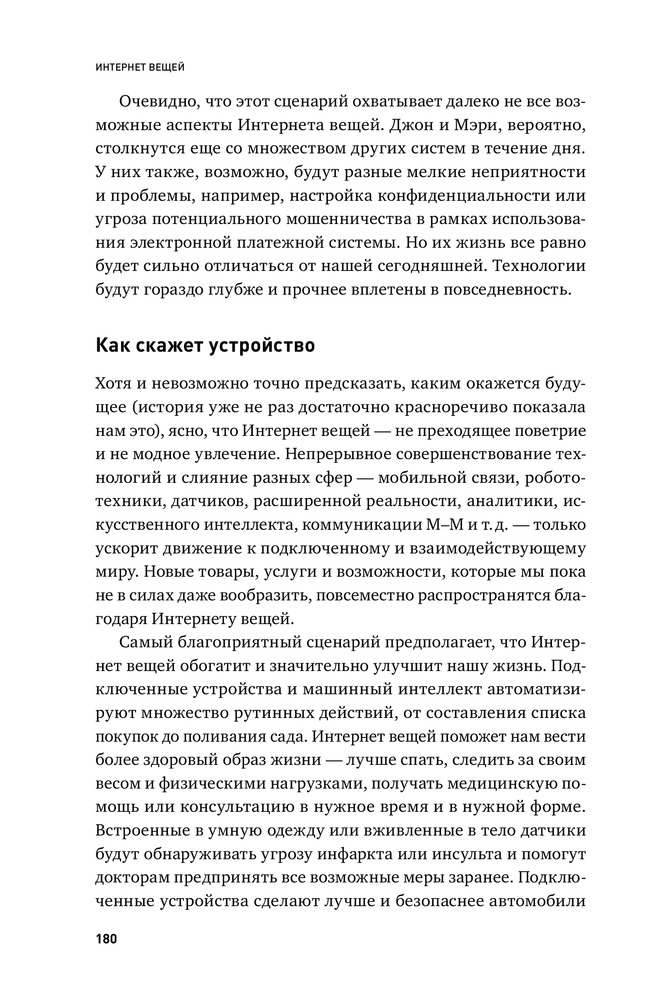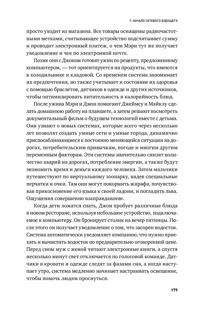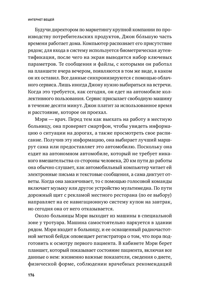 Интернет вещей. Будущее уже здесьВ данный момент этот товар отсутствует в продаже. Возможно, у нас найдется аналогичный или похожий товар здесь. Представьте: вы садитесь в машину, берете в руки книгу и отправляетесь в путь. Вам не нужно управлять машиной — она управляет собой сама. Вам даже не нужно говорить ей, куда ехать, потому что она уже сверилась с вашим ежедневником, а он, в свою очередь, сам себя заполнил, проверив вашу почту и электронный план тренировок. Автомобиль везет вас не в магазин, потому что дроны уже доставили продукты в ваш холодильник, который еще на прошлой неделе сам отправил заявку в интернет-магазин), и не на работу (необходимость в офисе давно отпала), а, скажем, в оперу. Такой мир предлагает нам Интернет вещей. |