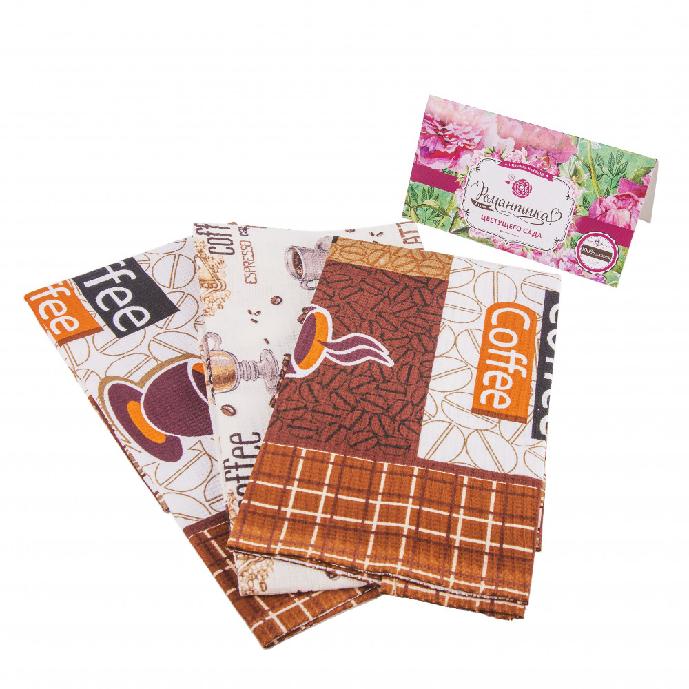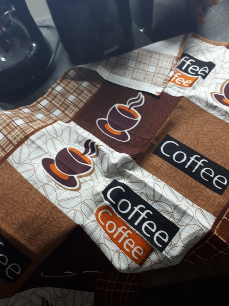 Получила заказанные полотенца, к качеству претензий нет. Но есть одно но, полотенца не все одинаковые, рисунок с чашкой кофе только на одном полотенце, что сверху. А внутри комплекта два полотенца совсем другой расцветки.