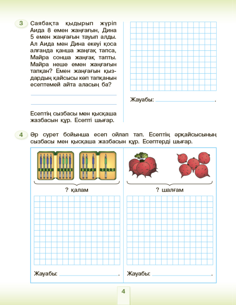 Баланың өздігінен оқып дамуына өте жақсы құрылған дəптер. Бастауыш сынып оқушысына түрлі түсті бояумен жасалған. Есептері өз сыныбына лайық.
