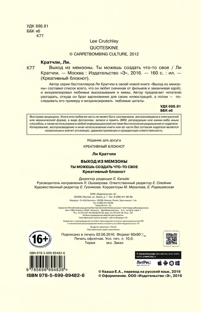Выход из мемзоны. Ты можешь создать что-то своеВ данный момент этот товар отсутствует в продаже. Возможно, у нас найдется аналогичный или похожий товар здесь. Серия: Креативный блокнот Автор серии бестселлеров, Ли Кратчли в своей новой книге «Выход из мемзоны» составил список всего, что он любит, (начиная от фильмов и заканчивая едой) и визуализировал любимые высказывания и мемы. Автор предлагает читателю разгадать, откуда он брал вдохновения для своих иллюстраций, а после — последовать его примеру и визуализировать любимые цитаты. |