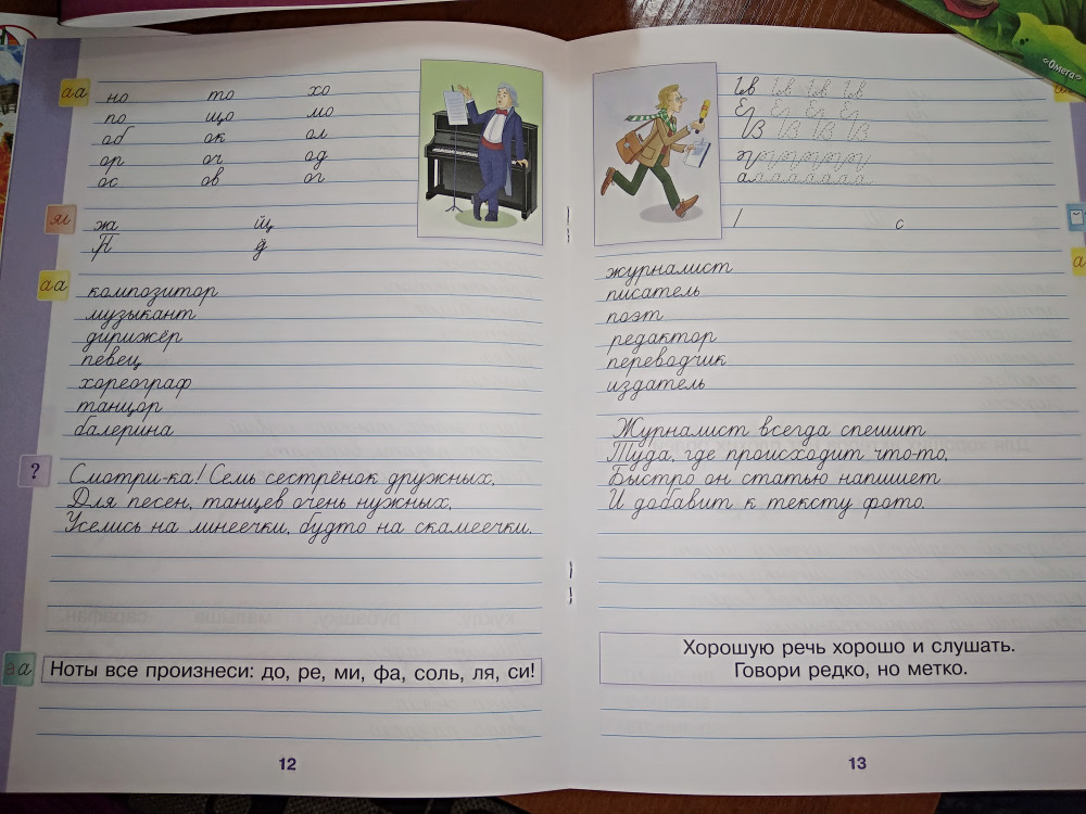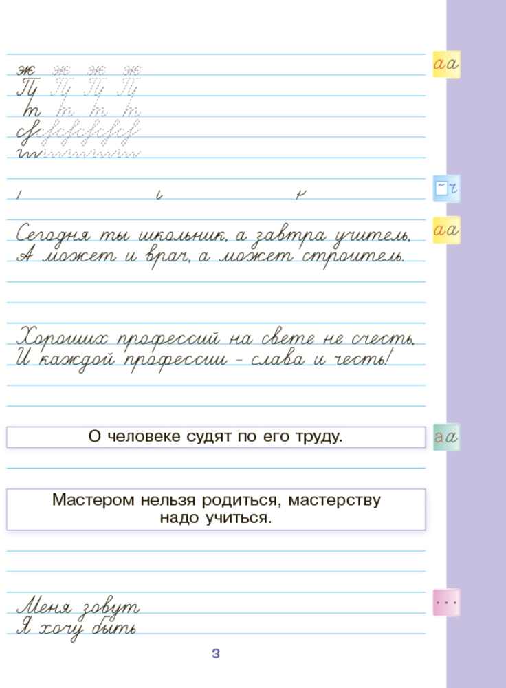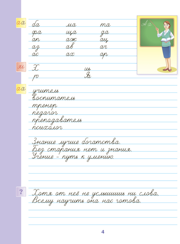 Для ребенка все понятно и каллиграфический почерк данный, как пример позволяет выработать ребенку правильный наклон и красиво написать буквы.