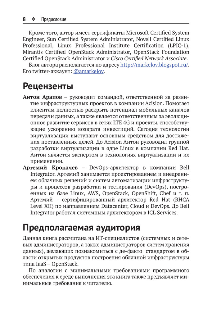 💳 Оплатить за товар можно при получении 🇰🇿 Есть бесплатная доставка по Казахстану от 1 дня 🎁 Копите бонусы с каждой покупки Книга знакомит читателя с основными сервисами облачной операционной системы OpenStack на начало 2018 года (версия Queens). Рассмотрены вопросы интеграции Open-Stack и системы работы с контейнерами Docker, программно-определяемой системы хранения данных Ceph, настройки производительности и высокой доступности сервисов. |
