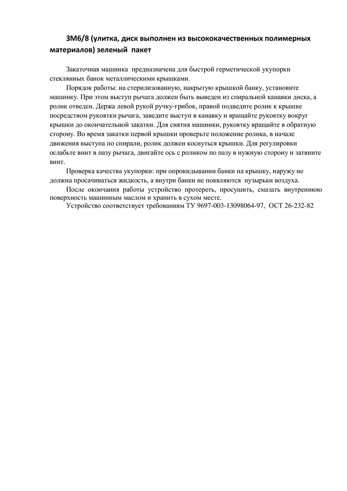 Механический завод «Конструктор» Машинка закаточная «Улитка» (6/8) для консервированияВ данный момент этот товар отсутствует в продаже. Возможно, у нас найдется аналогичный или похожий товар здесь. Машинка-полуавтомат обжимного типа предназначена для закупорки стеклянных банок при домашнем консервировании. |