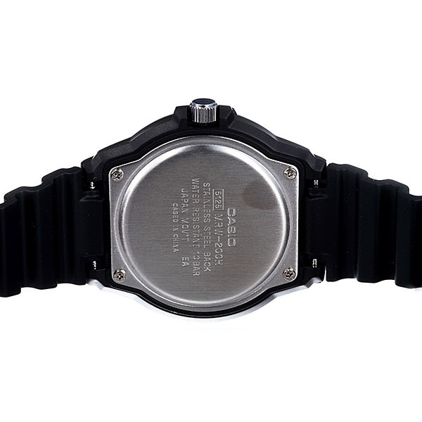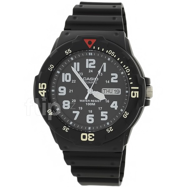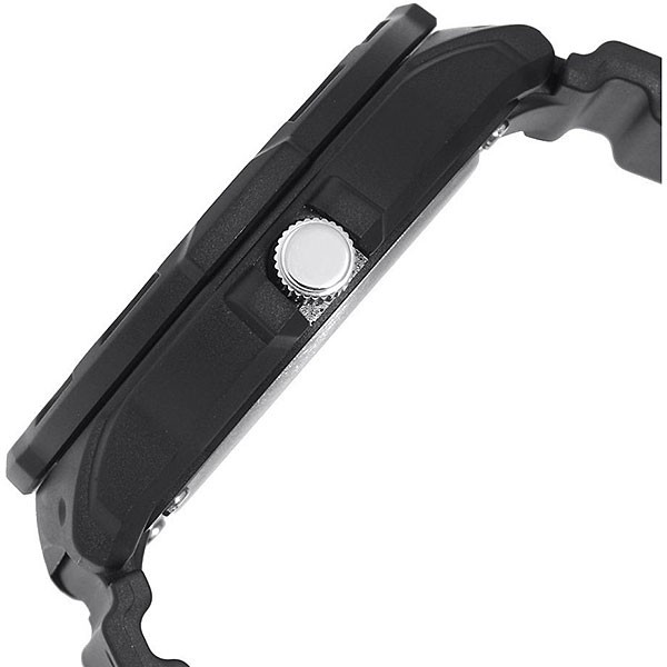 Наручные мужские часы в пластиковом корпусе на резиновом ремешке. Японский механизм кварцевый оснащен индикаторами даты и дня недели.