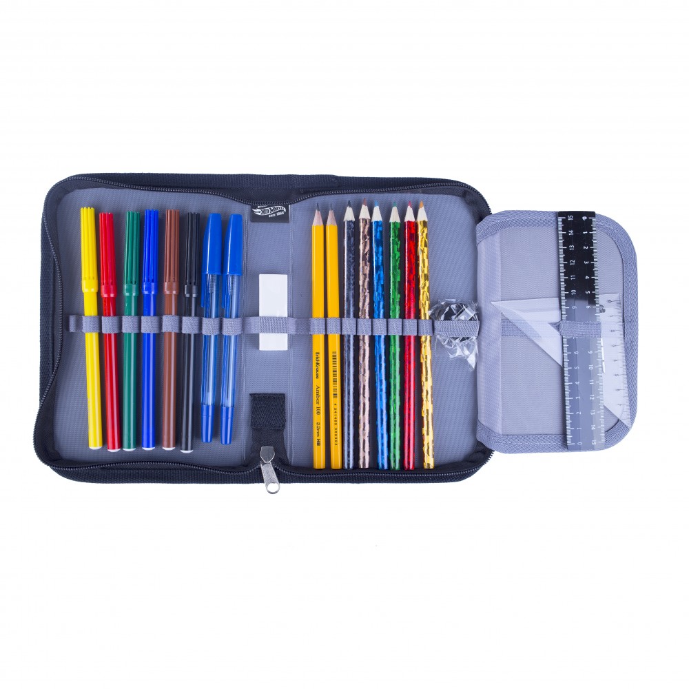Пенал классный, наполнен уже всеми принадлежностями. Фломастеры, ручки, карандаши, простые карандаши, резинка, линейки и точилка. При заказе не обратила внимание на то, что с наполнением, при получении была приятно удивлена. И сам пенал хорошего качества. Спасибо.