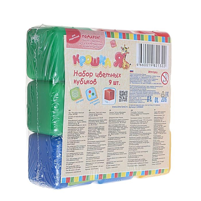 Кубики хорошие, яркие, легкие, пластик не пахнет. НО! Размер грани 4 см, а не 6, как в описании. На фото этикетки это видно :( Но поздно