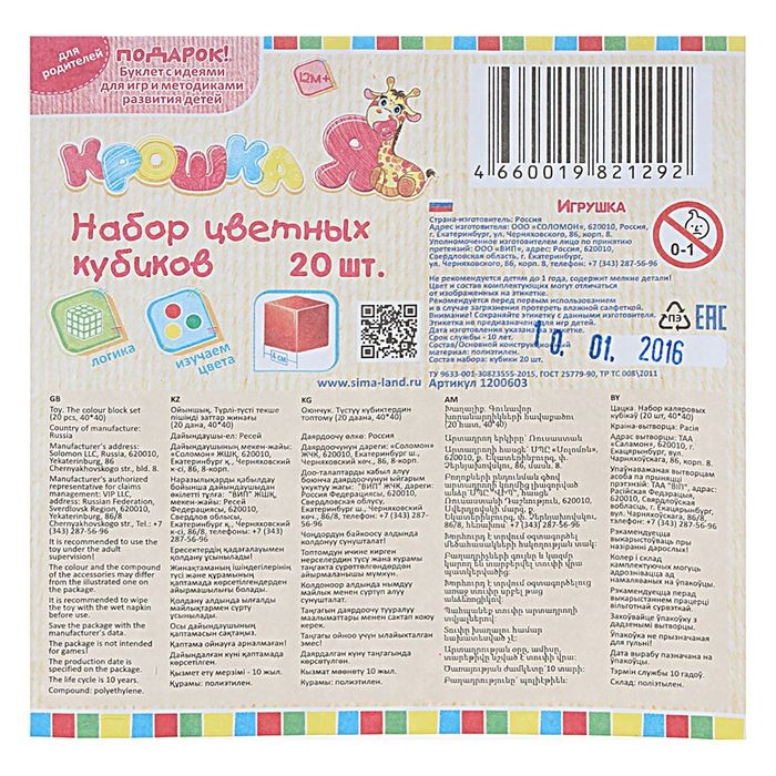 💳 Оплатить за товар можно при получении 🇰🇿 Есть бесплатная доставка по Казахстану от 1 дня 🎁 Копите бонусы с каждой покупки Набор цветных кубиков от ТМ «Крошка Я» воплотит в жизнь архитектурные фантазии вашего малыша. С его помощью он научится строить дома и мосты, возводить высокие башни и небольшие сооружения. |
