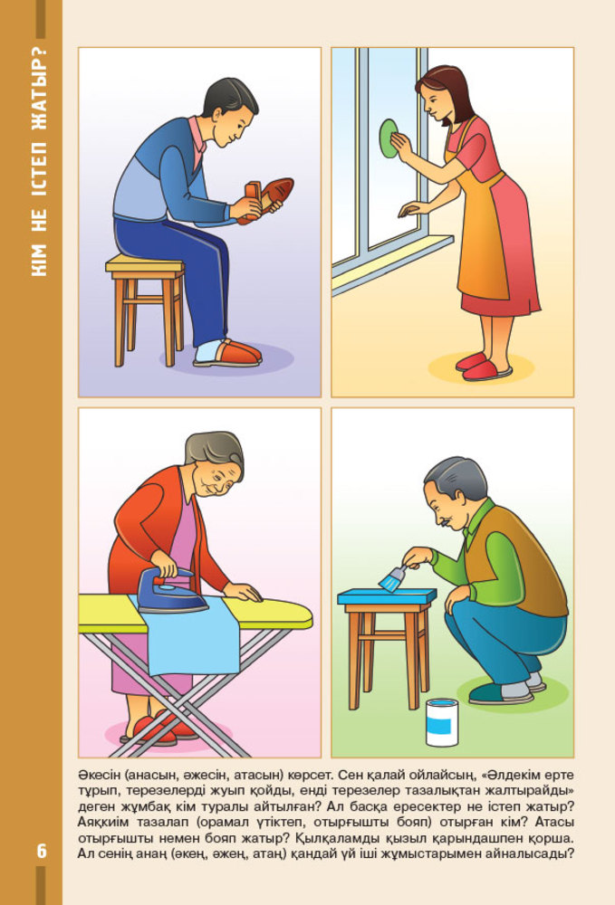 Бұл құралда қарапайым, ойын түрінде баланың адам туралы түсініктерін алыптастыруға, отбасы және қоғамдық өмір құбылыстары туралы білімдерін тереңдетуге көмектесетін материал ұсынылған. Бала адамның сыртқы дене ерекшеліктері (дене мүшелері), эмоциялық жағдайлары (эмоциялары, көңіл күйі) туралы алғашқы мәліметтерге ие болады. Баланың жақын адамдарының қызметтері туралы, ересектердің еңбек әрекеттері мен еңбек құралдары туралы білімдері тереңдеп, еңбек жемісіне қамқорлық көзқарасы дамиды. Баланың туған ел туралы бастапқы түсініктері қалыптасып, ол өзі тұратын қаланың (ауылдың) атауымен таныс болады.