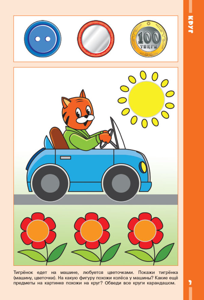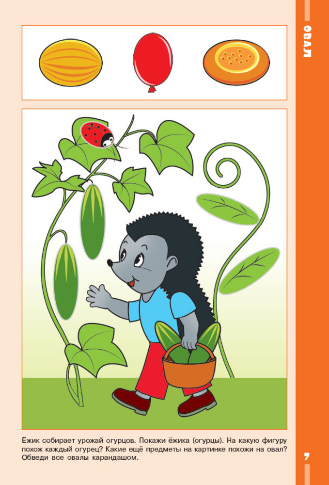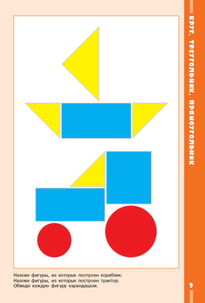 В данном пособии содержится материал, который в доступной, игровой форме познакомит ребёнка с пятью фигурами – кругом, квадратом, треугольником, прямоугольником и овалом. Для занятий на страницах 3 – 7 вам понадобятся вырезанные фигуры из дидактической игры-вкладки (по одной фигуре каждой формы). Показывая их ребёнку, попросите его определить, на какую фигуру похожи предметы, нарисованные в верхней части страницы. Затем познакомьте ребёнка с названием фигуры и предложите ему выполнить задания в пособии. При выполнении заданий на страницах 8 – 10 можно предложить ребёнку самостоятельно построить такие же предметы. Для этого надо заранее вырезать из цветного картона нужные фигуры. Если ребёнок уже знаком с основными цветами, можно спросить его, какого цвета каждая фигура.
