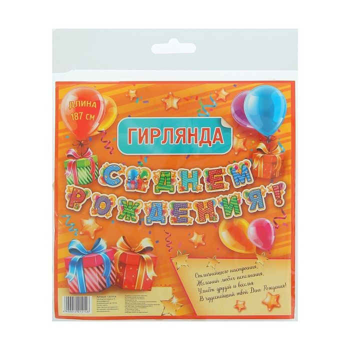 Гирлянда «С Днем рождения!»В данный момент этот товар отсутствует в продаже. Возможно, у нас найдется аналогичный или похожий товар здесь. Гирлянда «С Днем рождения!» — прекрасный аксессуар для украшения комнаты или зала! Он станет отличным дополнением любого праздника. Буквы скреплены с помощью люверсов, что позволяет свободно трансформировать гирлянду. На лицевой стороне напечатана красочная надпись. Аксессуар легко крепится на стену или дверной проём с помощью клейкой ленты или кнопок. |