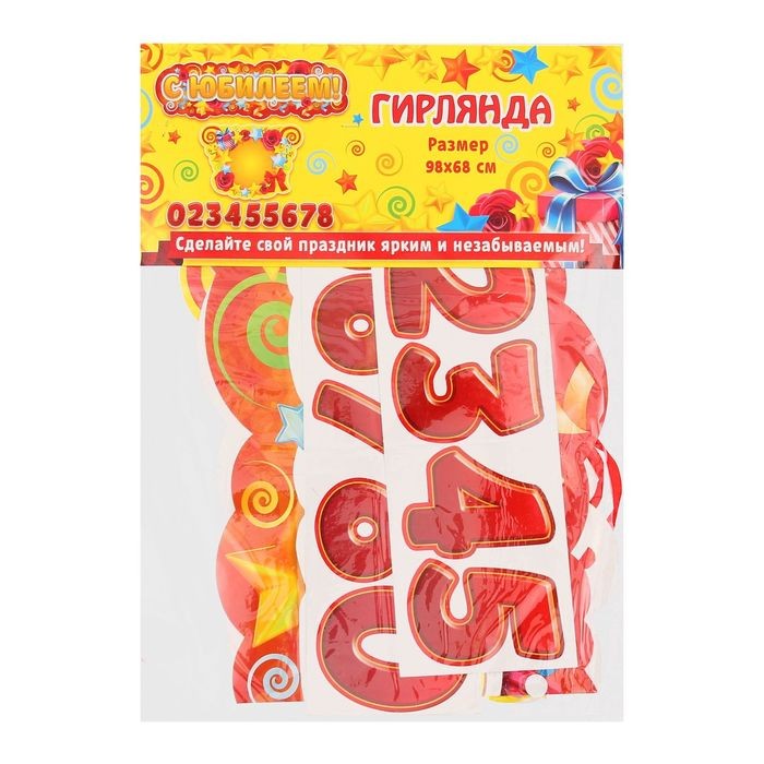 Хотите создать особую атмосферу праздника и красиво оформить комнату или кабинет? Тогда этот аксессуар для вас! Гирлянда-плакат — это украшение 3 в 1, которое сочетает в себе большой плакат, гирлянду и наклейки с цифрами. Декор легко крепится на стену с помощью клейкой ленты или кнопок. Элементы гирлянды соединены между собой атласной лентой. Рисунок напечатан с одной стороны. В комплект входят наклейки с цифрами для юбилея (от 20 до 85 лет), которые можно приклеить на подвеску гирлянды.