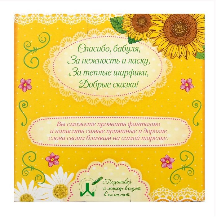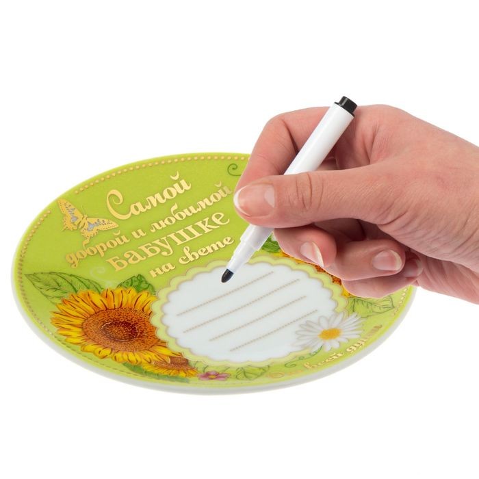 Тарелка с фломастером «Самой доброй бабушке» станет дорогим сердцу сюрпризом, который будет напоминать о любви внука или внучки. Тёплый узор и добрые слова и пожелания, написанные вами специальным фломастером из набора, поднимут бабушке настроение, и уж поверьте — она будет показывать тарелку всем знакомым и с гордостью рассказывать, чей это подарок.