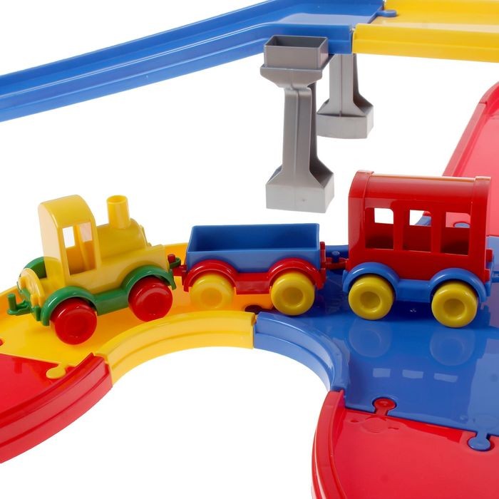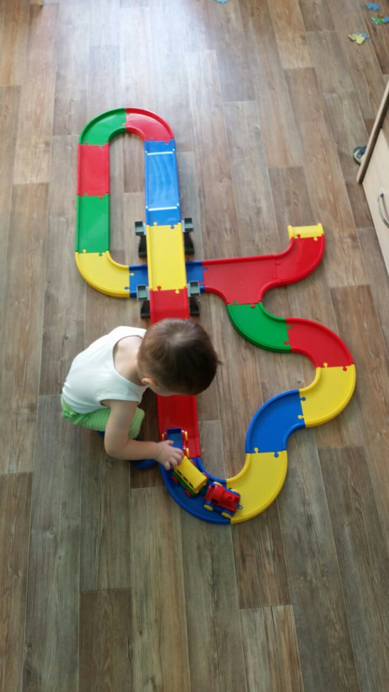 Классная дорога, яркая, большая. Можно по разному соединять детали. Наклейки в виде рельс приклеивать не стали, чтобы можно было её мыть. Ребёнку 2 года, он в восторге, играет каждый день. Так как нет рельс и она широкая, можно катать по ней разные машинки. Вагончики отцепляются друг от друга, обычный поезд без батареек - нужно катать самому.