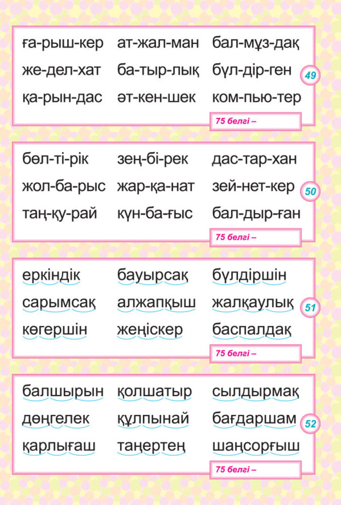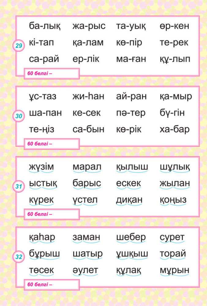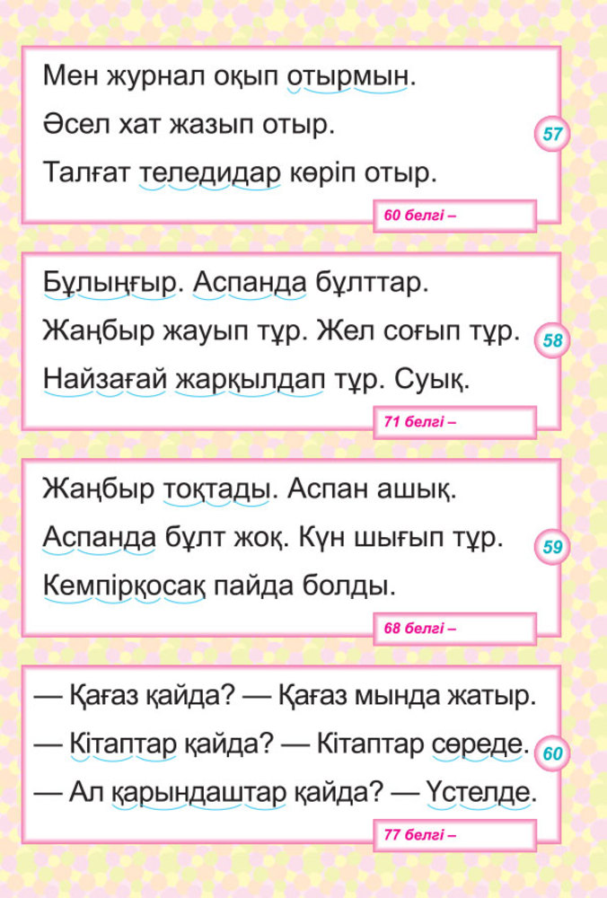 Кітап өте тамаша, женілден күрделіге принциптері негізделген. Баланың тез оқып кетуіне көмектеседі.