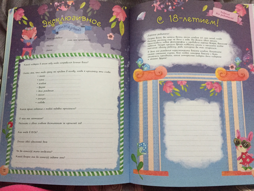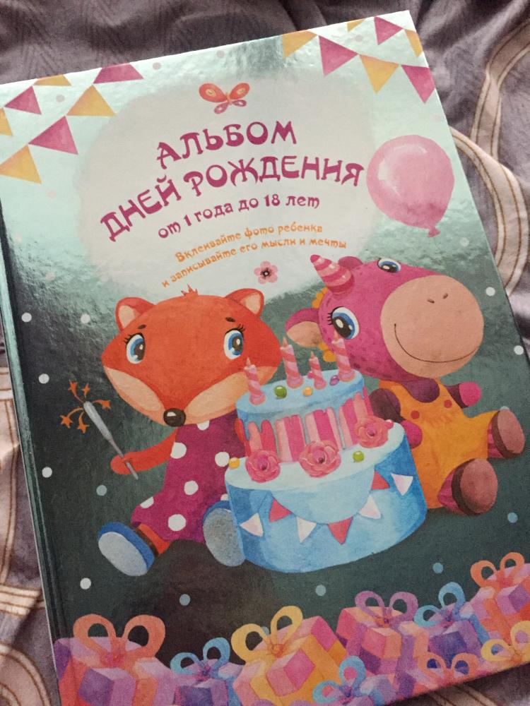Ооочень красивый альбом!!! Я не пожалела ни капли. Закажу еще 2. На фото не видно, но он перламутровый. В этот альбом записываются события, мысли, какие-то фразы и прочее. Есть место для фото. Так же есть задания для малыша. Уделены страницы каждому году. В конце собирательные фото за все 18 лет. Не пожалеете!!!
