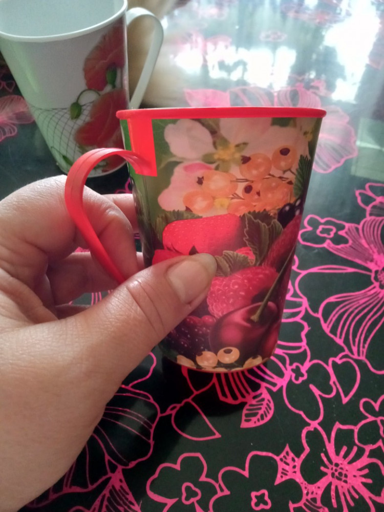 Кружка очень яркая, красивая. Пластмасса тонкая. Легкая, для дороги то, что нужно.