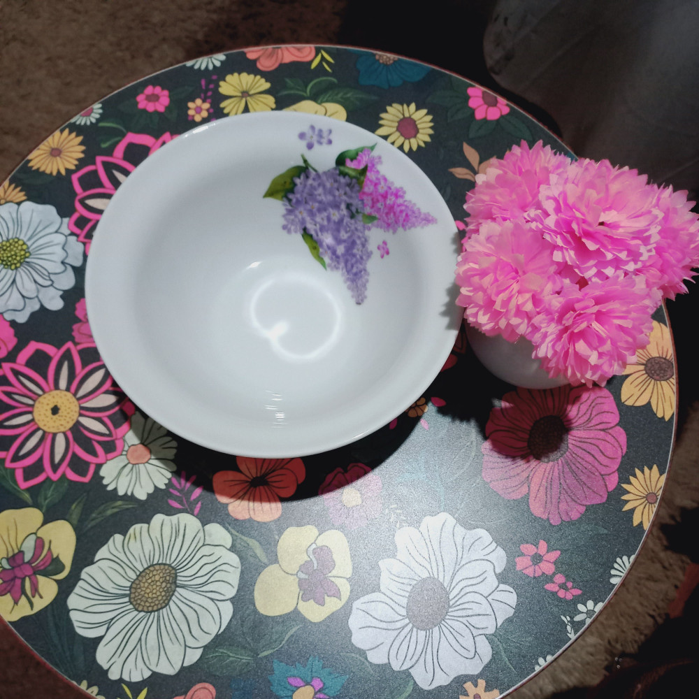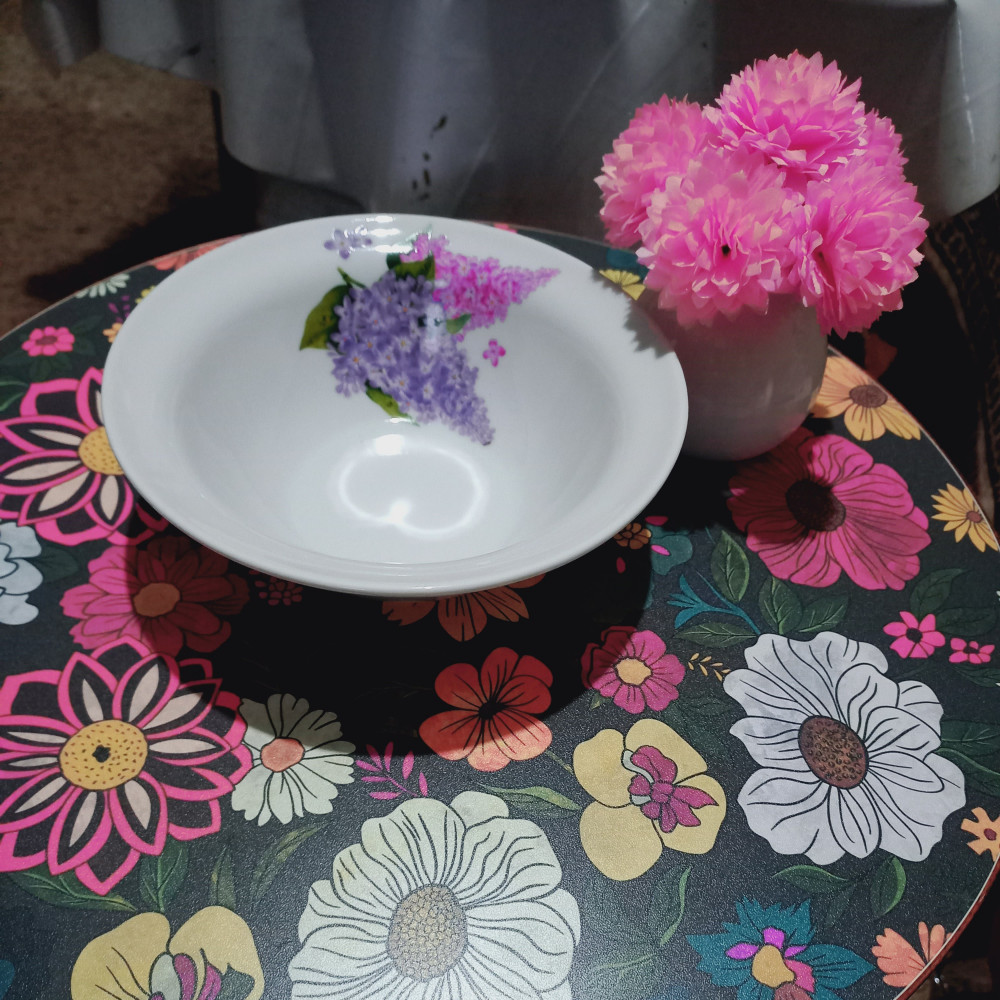 Обновил автопарк глубоких тарелок. У нас три особи мужского пола (папа и сыновья) и один цветочек женского пола (собственно говоря хозяюшка). Нам с маками, ну а ей с сиренью.