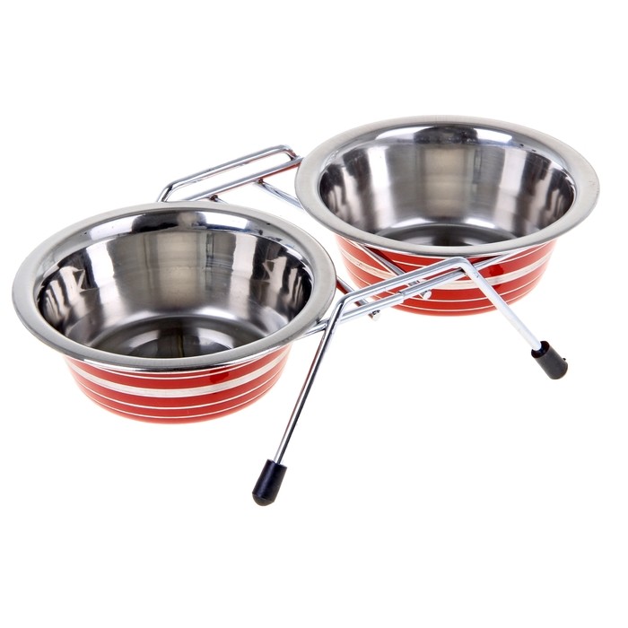 Набор: миска двойная цветная с полосой на подставке, 2×200 мл предназначена для корма и воды. Имеет удобную форму чашечек, чтобы животное могло вылизывать их полностью, не прилагая усилий. Подставка оборудована нескользящими ножками.