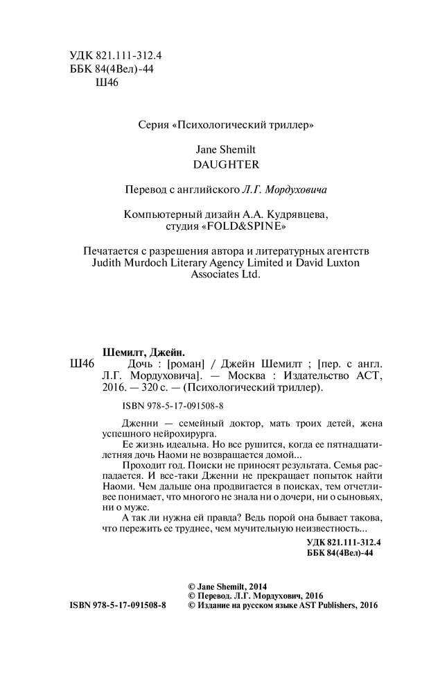 ДочьВ данный момент этот товар отсутствует в продаже. Возможно, у нас найдется аналогичный или похожий товар здесь. Серия: Психологический триллер Дженни — семейный доктор, мать троих детей, жена успешного нейрохирурга. Ее жизнь идеальна. Но все рушится, когда ее пятнадцатилетняя дочь Наоми не возвращается домой... |