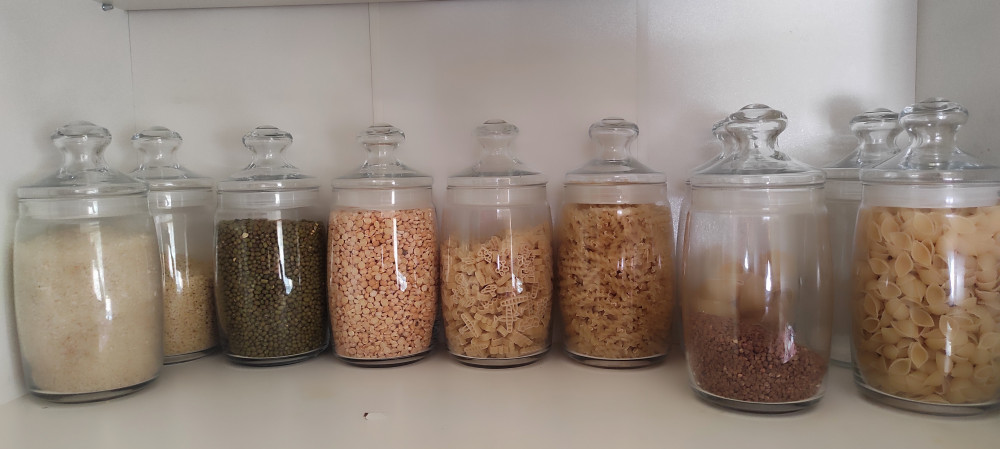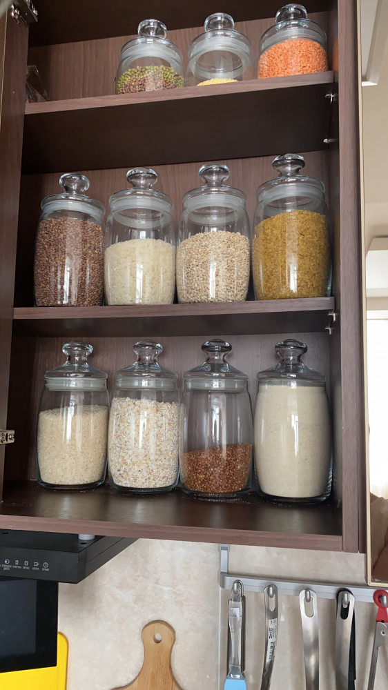 Красиво смотрятся с крупами (иначе и быть немогло), но резинки на крышках держатся слабо, при каждом открывании банки, резинка спрыгивает в крупу))Все время приходится доставать и натягивать ее обратно