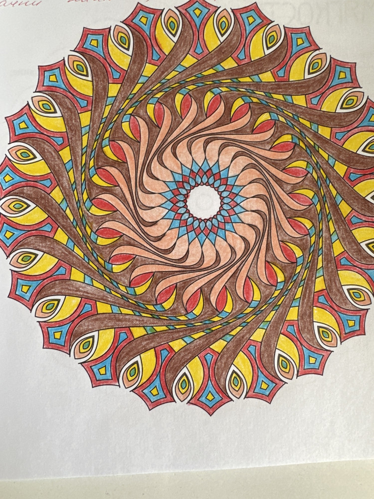 Люблю мандалы раскрашивать! Чем нравится эта, есть описание, что не мало важно! Когда начинаешь раскрашивать, погружаешься полностью в процесс начинаешь ловить свои мысли, анализируешь ситуации... происходит диалог с самой собой) например, у меня это так происходит) ещё я люблю одновременно слушать какую-нибудь мантру.