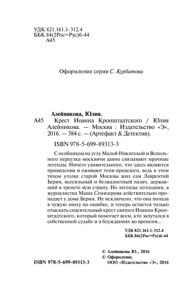 Крест Иоанна КронштадтскогоВ данный момент этот товар отсутствует в продаже. Возможно, у нас найдется аналогичный или похожий товар здесь. Серия: Артефакт-детектив С особняком на углу Малой Никитской и Вспольного переулка москвичи давно связывают мрачные легенды. Ничего удивительного, что здесь являются привидения и оживают тени прошлого, ведь в этом тихом уголке старой Москвы жил сам Лаврентий Берия, всесильный и безжалостный палач, державший в трепете всю страну. Но легенды легендами, а журналистка Маша Семизерова действительно пропадает у дома Берии. Не исключено, что она попала в чужую эпоху по ошибке, и теперь остается только отыскать спасительный крест святого Иоанна Кронштадтского, который помогает всем, кто запутался в собственной судьбе и в блужданиях во времени... |