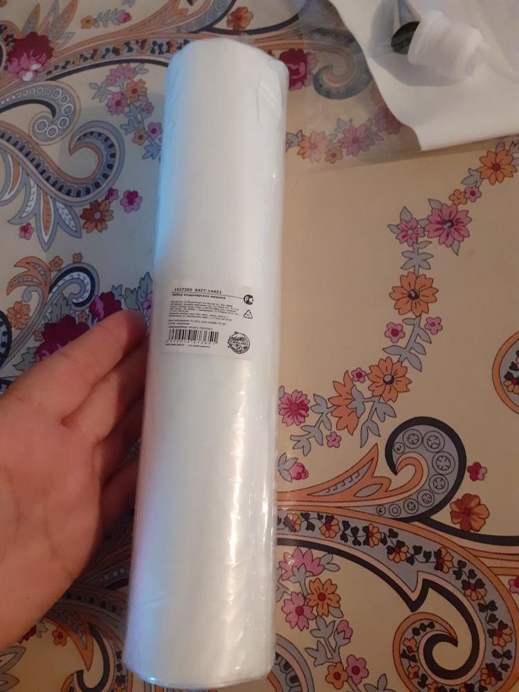 Рулон кондитерских мешков очень дорогой! Тем более без скидки купила! Но учитывая размер (длина 50см, кончик отрезать получится 45см) и количество мешков 72шт - это здорово! Редкость! Качество хорошее, плёнка не тонкая. Я соединила насадку ИЗ ДРУГОГО НАБОРА сюда, получилось отлично! 👍 Насадки нет в наборе, здесь длинные кондитерские мешки и их много.