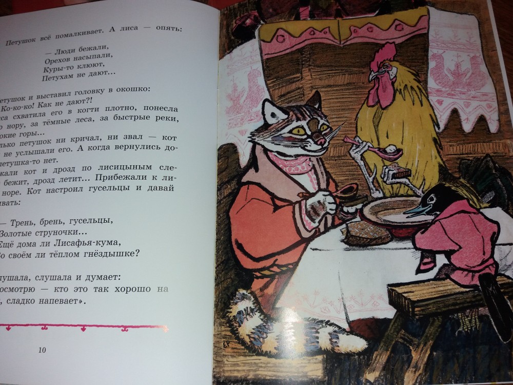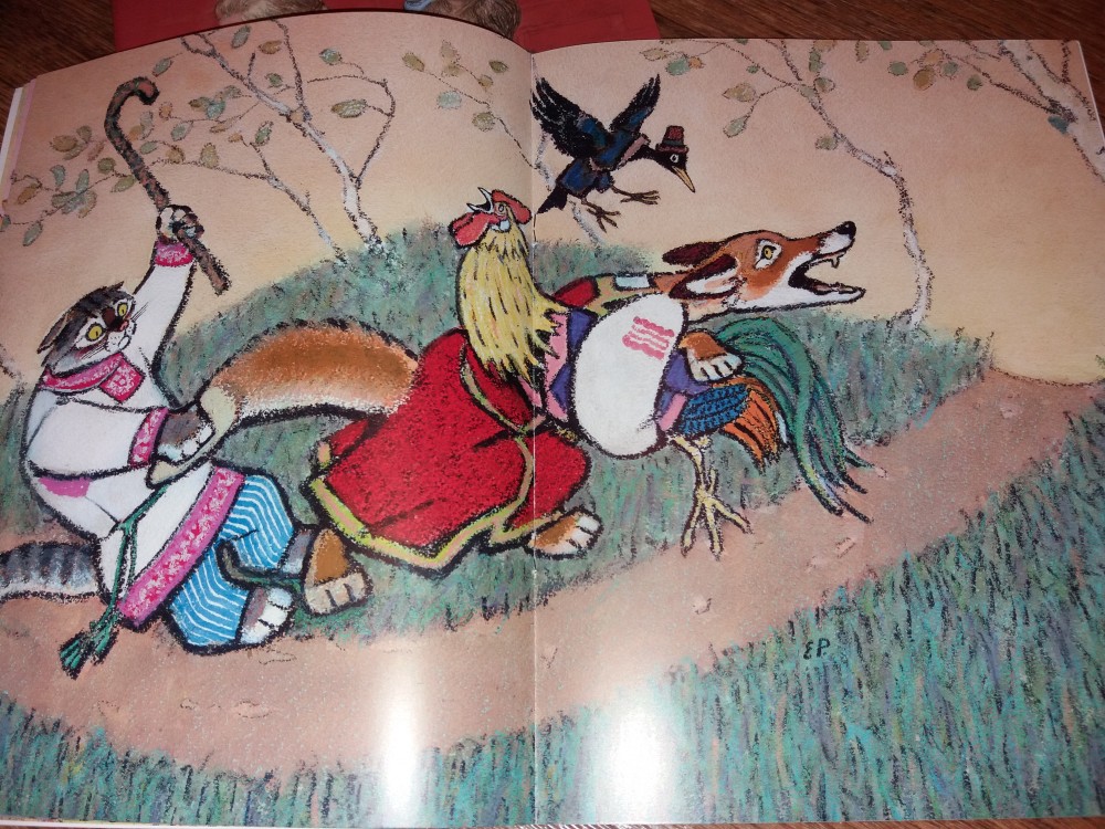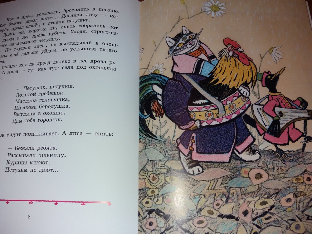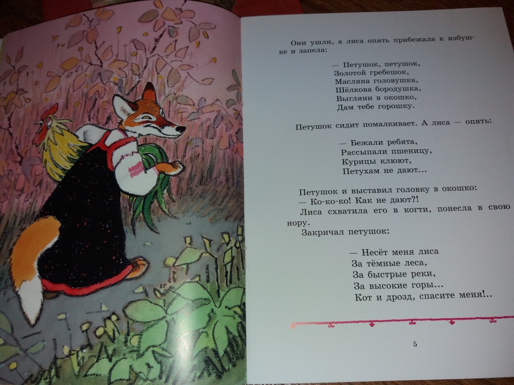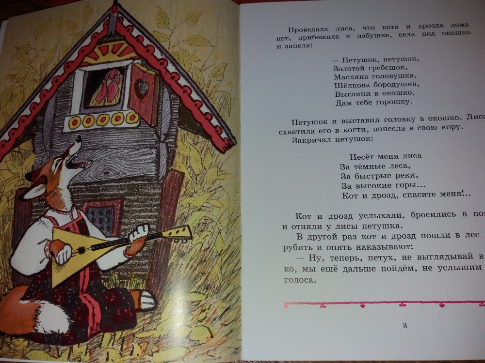 Во-первых, динамичный и назидательный сюжет о глуповатом петушке, который трижды попадался на лисьи уловки и оказывался у неё в лапах. Хорошо, что надёжные друзья кот и дрозд каждый раз выручали его из беды.