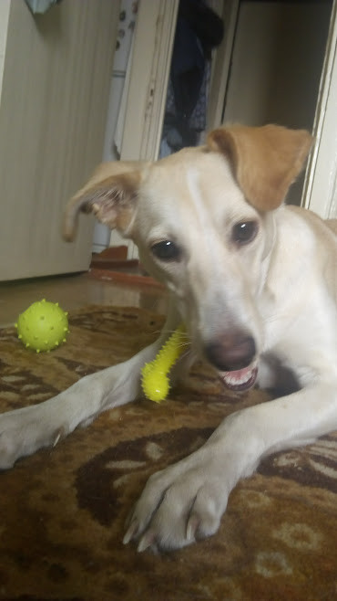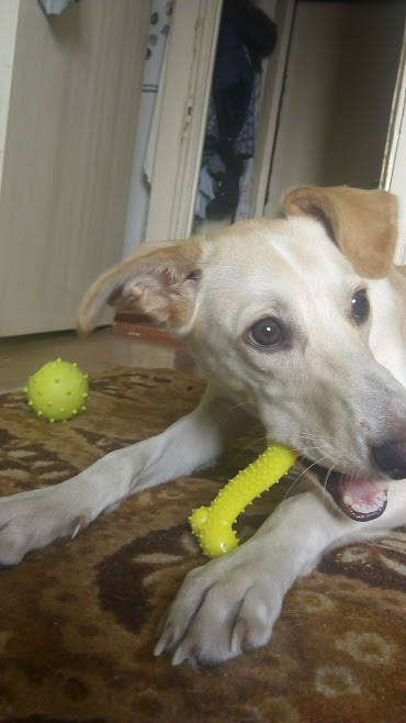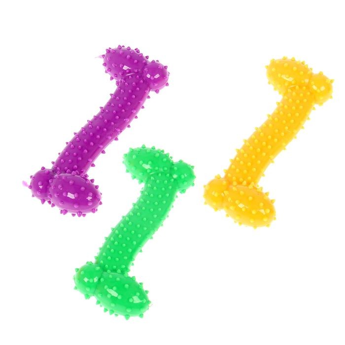 Игрушка симпатичная. У меня тоже синего цвета. Моя собака (кокер-спаниель) ее не сгрызла, она ее съела. Подойдет только для маленьких собак.
