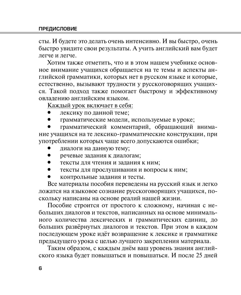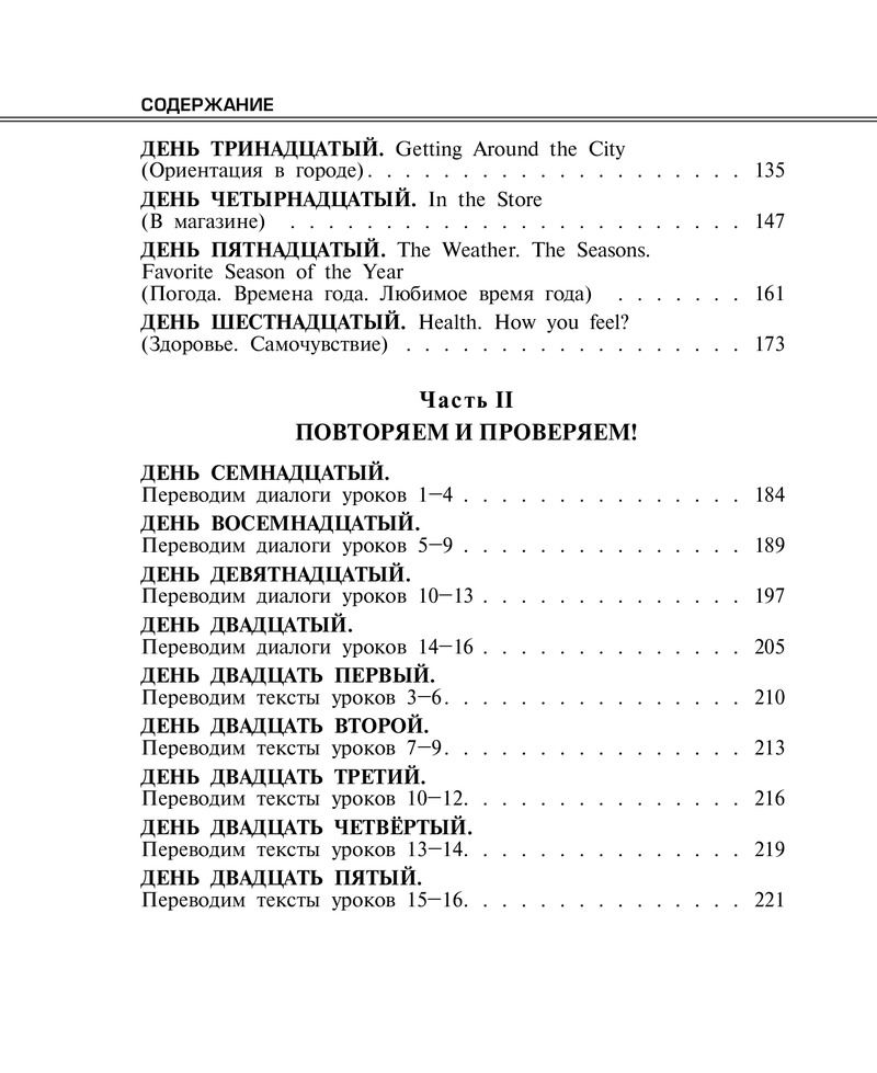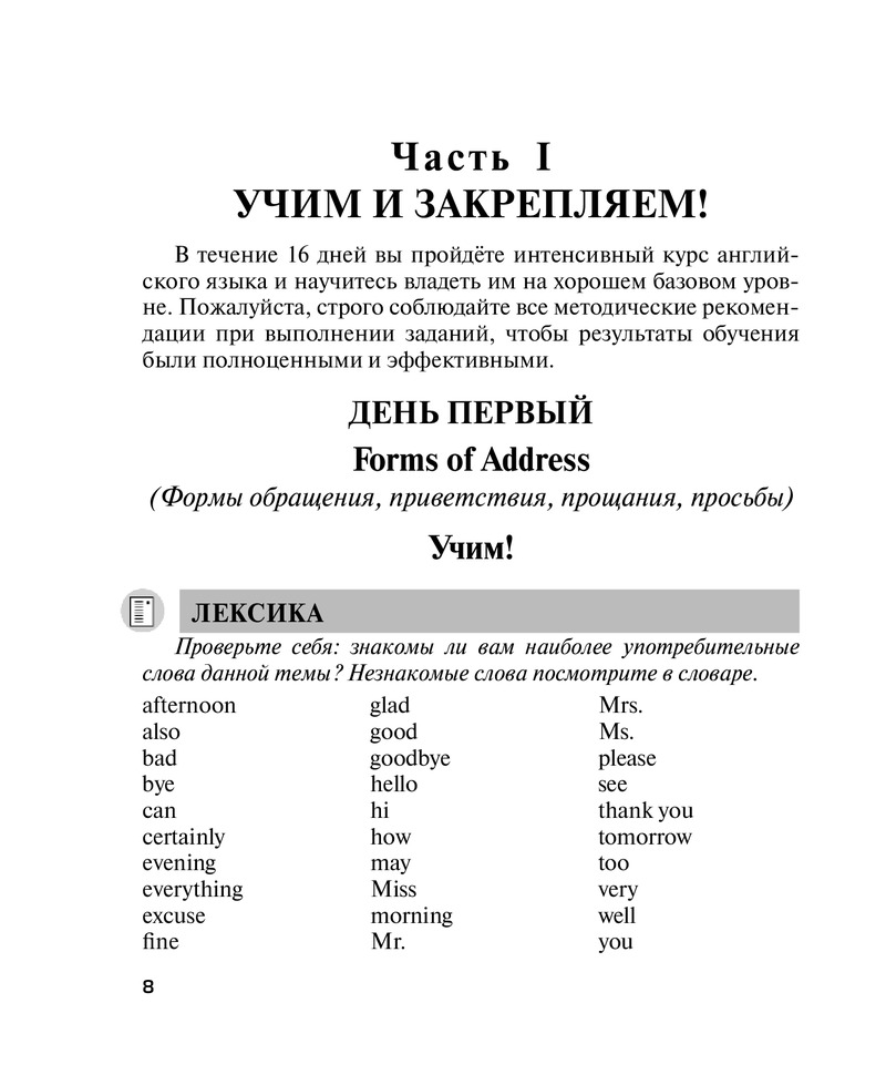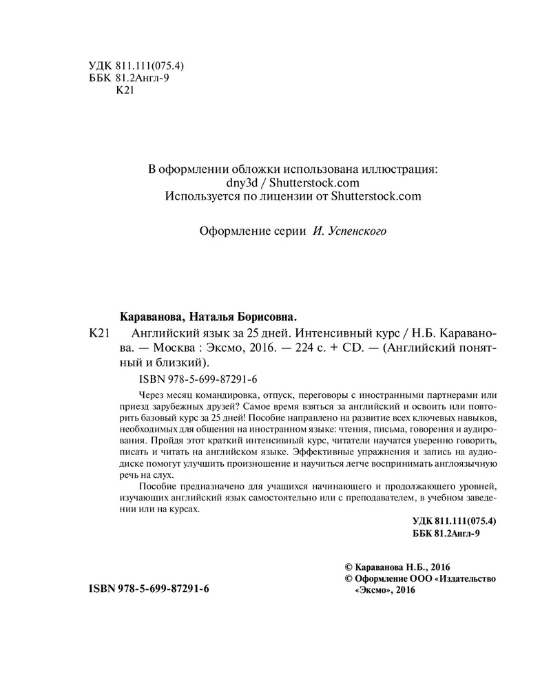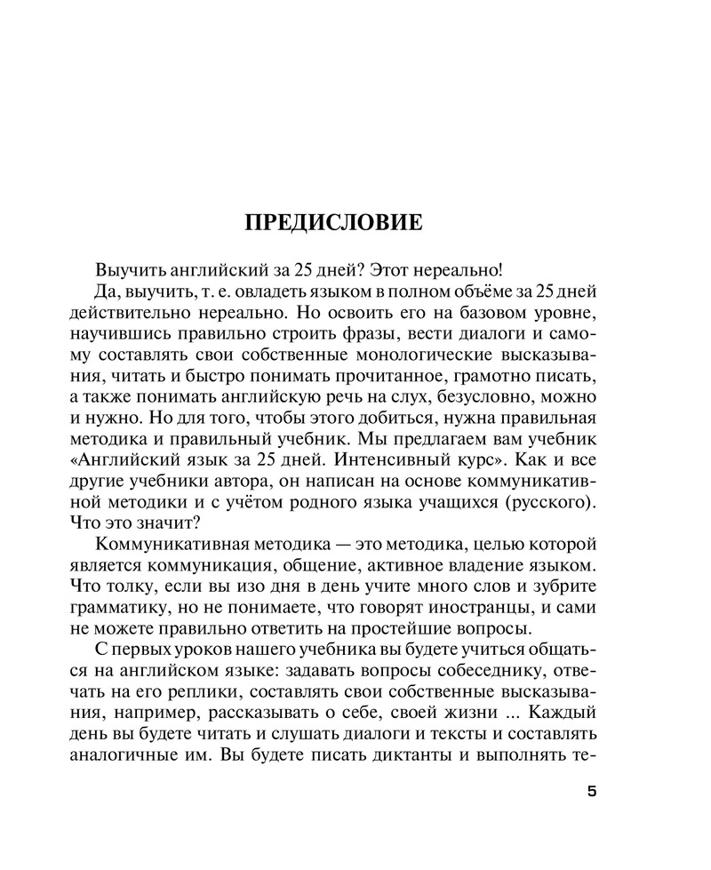 Английский язык за 25 дней. Интенсивный курс (+CD)В данный момент этот товар отсутствует в продаже. Возможно, у нас найдется аналогичный или похожий товар здесь. Серия: Английский понятный и близкий Через месяц командировка, отпуск, переговоры с иностранными партнерами или приезд зарубежных друзей? Самое время взяться за английский и освоить или повторить базовый курс за 25 дней! Пособие направлено на развитие всех ключевых навыков, необходимых для общения на иностранном языке: чтения, письма, говорения и аудирования. Пройдя этот краткий интенсивный курс, читатели научатся уверенно говорить, писать и читать на английском языке. Эффективные упражнения и запись на аудиодиске помогут улучшить произношение и научиться легче воспринимать англоязычную речь на слух. |