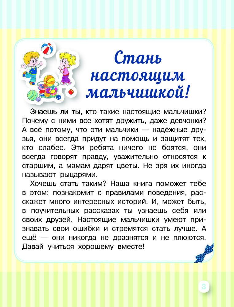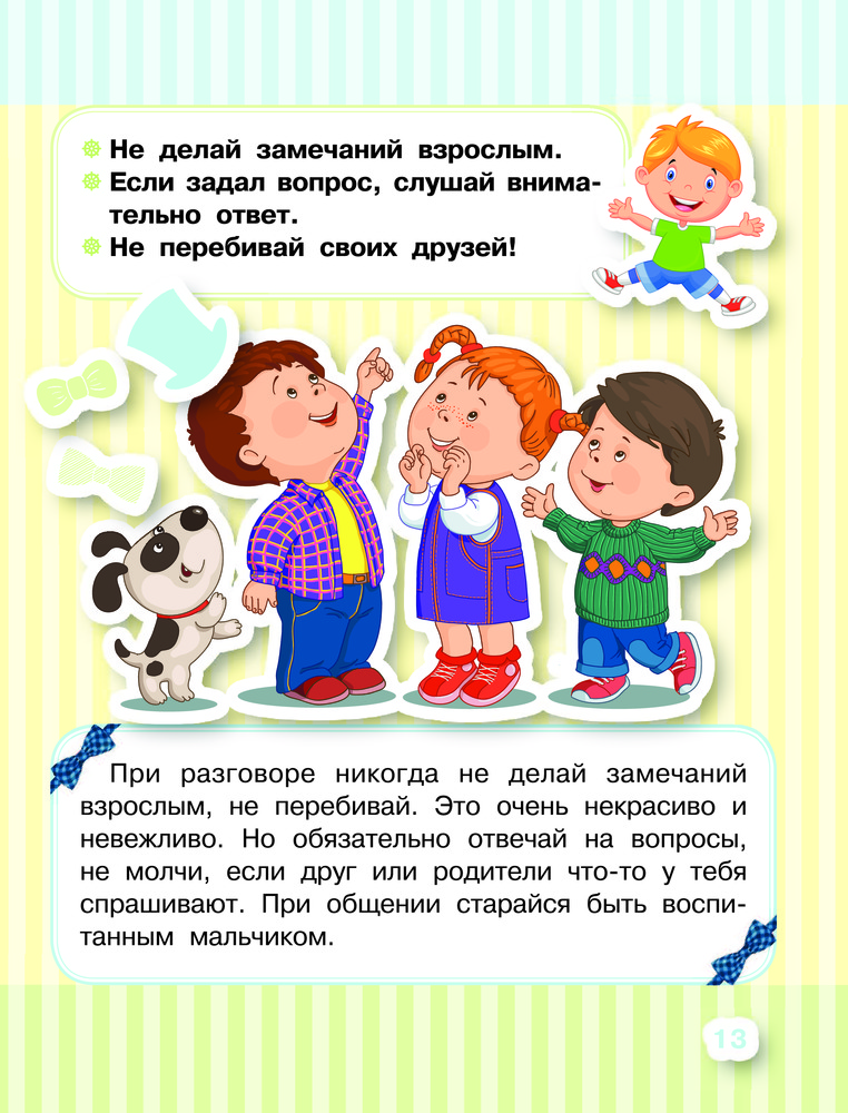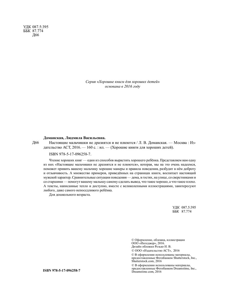 Настоящие мальчишки не дразнятся и не плюютсяВ данный момент этот товар отсутствует в продаже. Возможно, у нас найдется аналогичный или похожий товар здесь. Серия: Хорошие книги для хороших детей Чтение хороших книг — один из способов вырастить хорошего ребёнка. Представляем вам одну из них «Настоящие мальчишки не дразнятся и не плюются», которая, надеемся, поможет привить вашему мальчику хорошие манеры и правила поведения, разбудит в нём доброту и отзывчивость, а множество примеров, приведённых на страницах книги, воспитает настоящий мужской характер. Сравнительные ситуации поведения — дома, в гостях, на улице, со сверстниками и со старшими — помогут вашему малышу самому сделать вывод, что такое хорошо, а что такое плохо. А тексты, написанные тепло и доступно, вместе с великолепными иллюстрациями, заинтересуют любого, даже самого непоседливого ребёнка. |