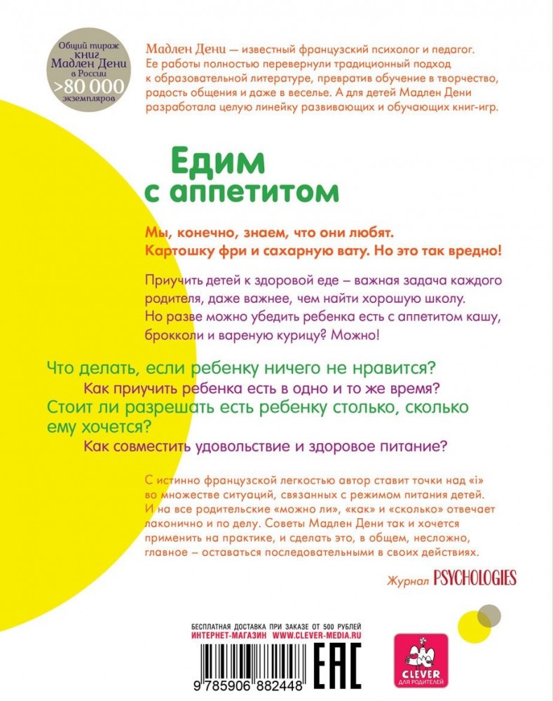 Едим с аппетитом. Советы и хитрости на каждый деньВ данный момент этот товар отсутствует в продаже. Возможно, у нас найдется аналогичный или похожий товар здесь. Серия: Методика воспитания Мадлен Дени Эта книга называется «Советы и хитрости». Мадлен Дени знает много секретов. Как обедать в хорошем настроении, как садиться за стол в одно и то же время, как позволить ребенку выбрать себе меню и съесть столько, сколько хочется. А еще советы: как накормить самых маленьких и потом отмывать потолки от каши, что положить школьнику с собой на учебу, как помочь девочке сохранить стройность… |