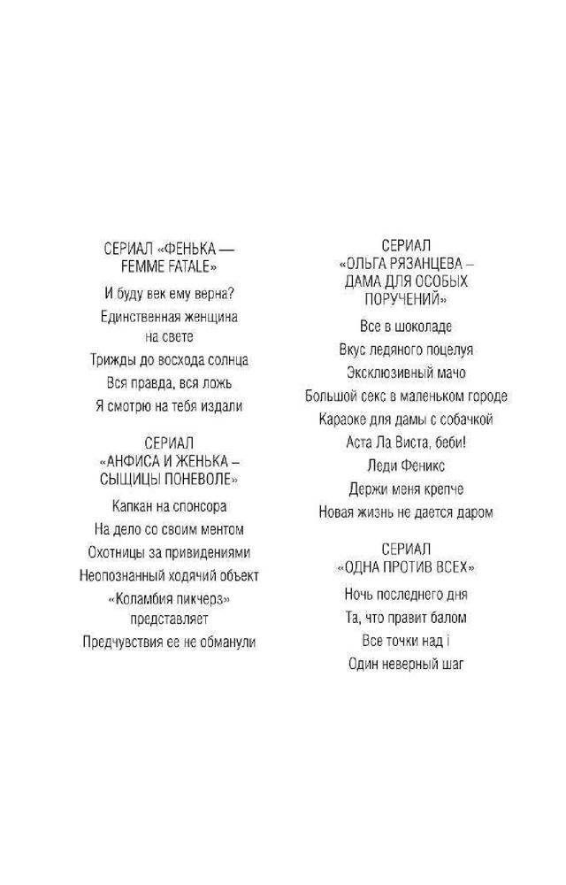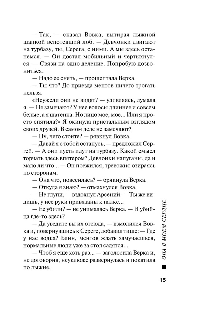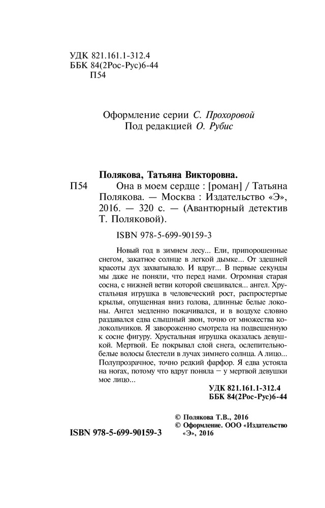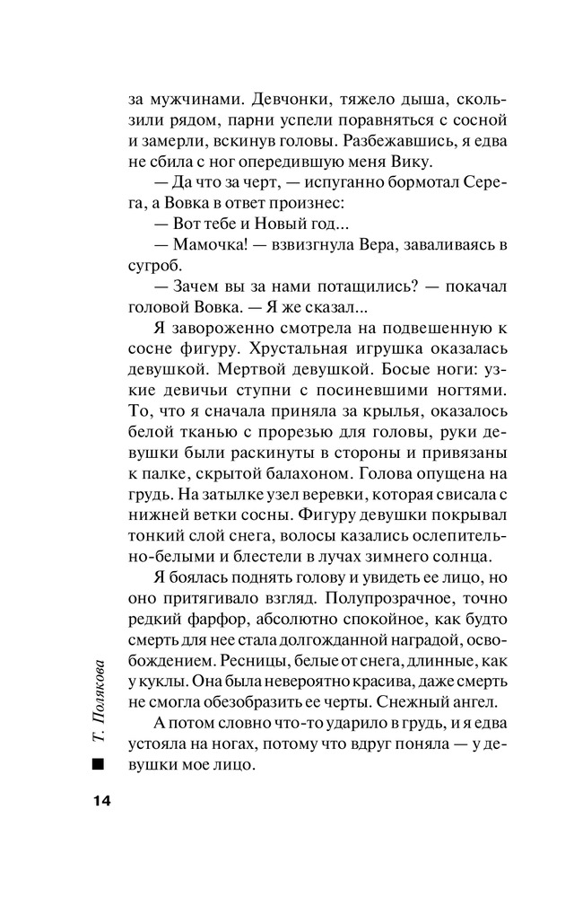 Она в моем сердцеВ данный момент этот товар отсутствует в продаже. Возможно, у нас найдется аналогичный или похожий товар здесь. Серия: Авантюрный детектив Т. Поляковой (новая серия) Новый год в зимнем лесу... Ели, припорошенные снегом, закатное солнце в легкой дымке... От здешней красоты дух захватывало. И вдруг... В первые секунды мы даже не поняли, что перед нами. Огромная старая сосна, с нижней ветви которой свешивался... ангел. Хрустальная игрушка в человеческий рост, распростертые крылья, опущенная вниз голова, длинные белые локоны. Ангел медленно покачивался, и в воздухе словно раздавался едва слышный звон, точно от множества колокольчиков. Я заворожено смотрела на подвешенную к сосне фигуру. Хрустальная игрушка оказалась девушкой. Мертвой. Ее покрывал слой снега, ослепительно белые волосы блестели в лучах зимнего солнца. А лицо... Полупрозрачное, точно редкий фарфор. Я едва устояла на ногах, потому что вдруг поняла — у мертвой девушки мое лицо... |