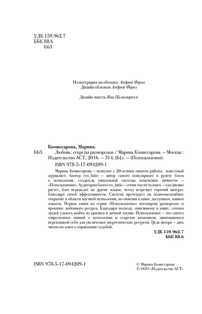 Любовь: секреты разморозкиВ данный момент этот товар отсутствует в продаже. Возможно, у нас найдется аналогичный или похожий товар здесь. Серия: Психоалхимия Марина Комиссарова — психолог с 20-летним опытом работы, известный журналист, блогер evo_lutio — автор самого популярного в рунете блога о психологии, создатель уникальной системы изменения личности — Психоалхимии. Аудитория блога evo_lutio — сотни тысяч человек — ежедневно растет, блог переводят на другие языки, метод встречает горячий интерес благодаря своей эффективности. Система претендует на полномасштабное открытие в области научной психологии, но описана в книге доступным, живым языком. Первая книга из серии «Психоалхимии» посвящена разморозке и прокачке любовного ресурса. Благодаря подходу, описанному в книге, сотням людей удалось выйти из кризиса в личной жизни. Психоалхимия — это синтез современных знаний о психологии и секретов алхимиков, занимавшихся переплавкой себя для увеличения энергетических ресурсов. Цель автора — дать читателю ключ к управлению судьбой. |