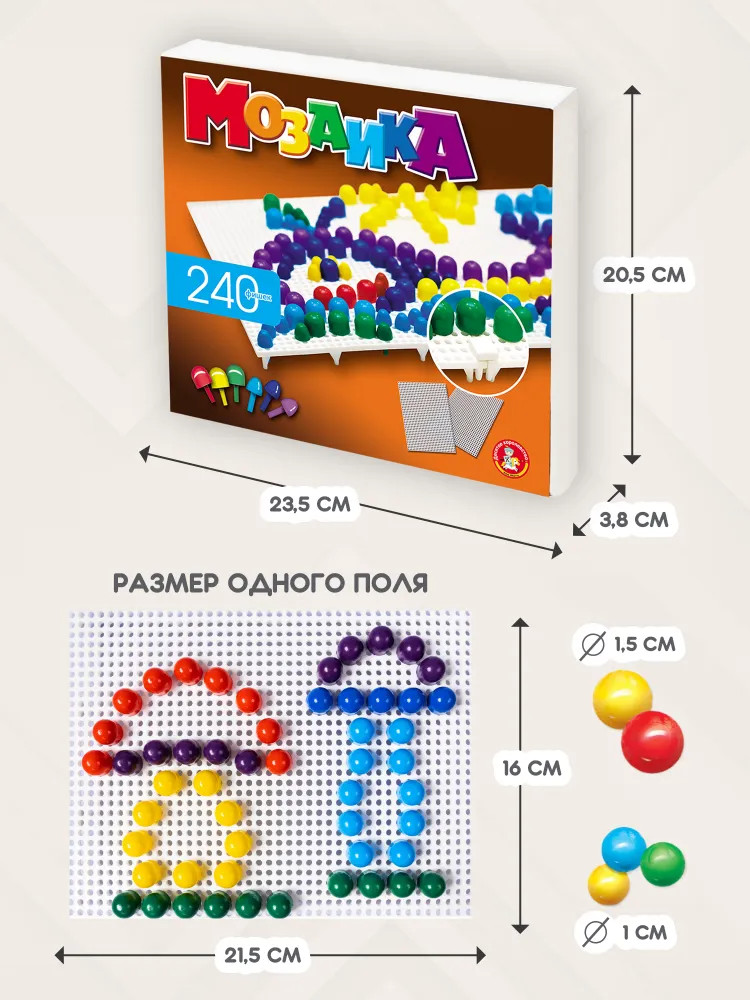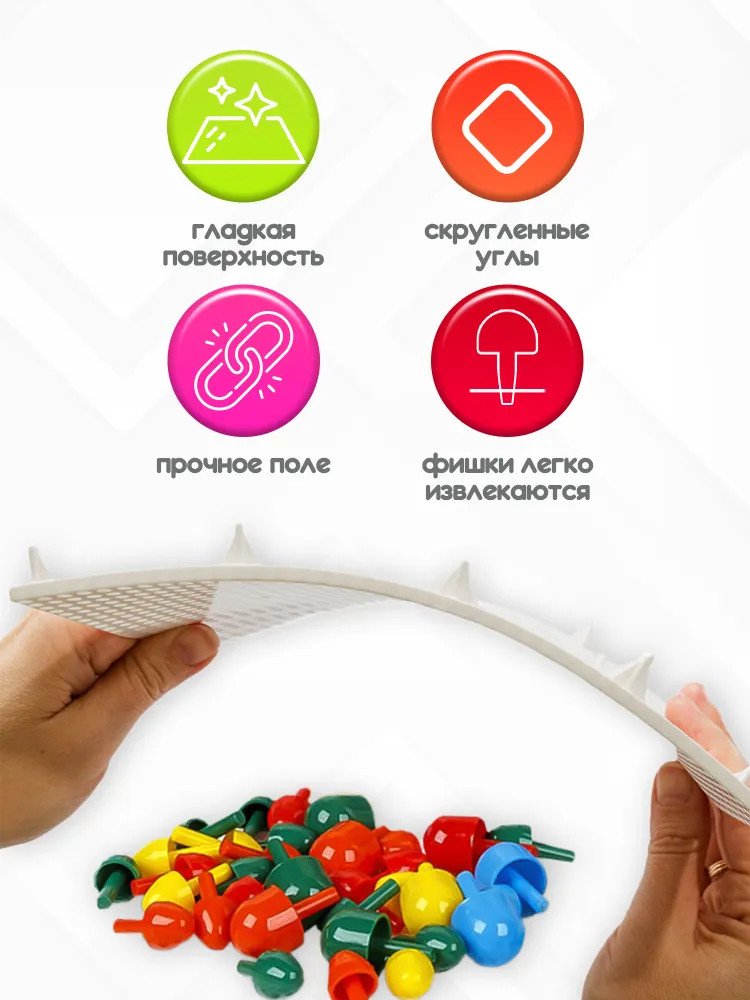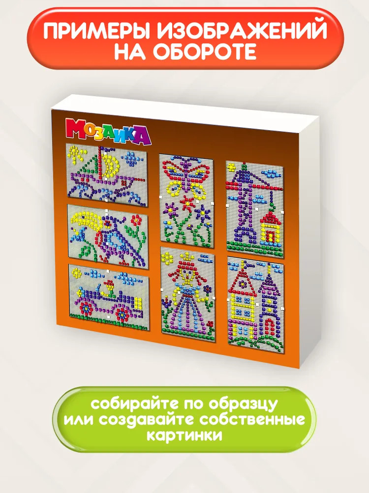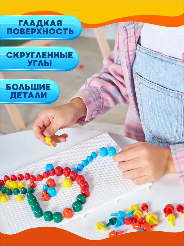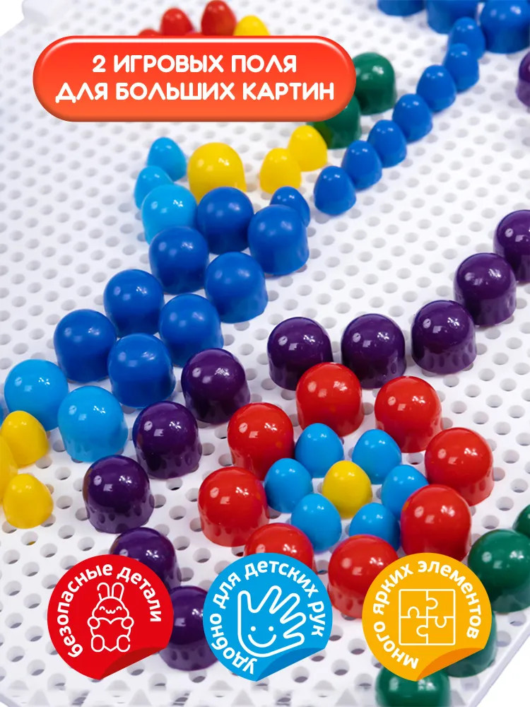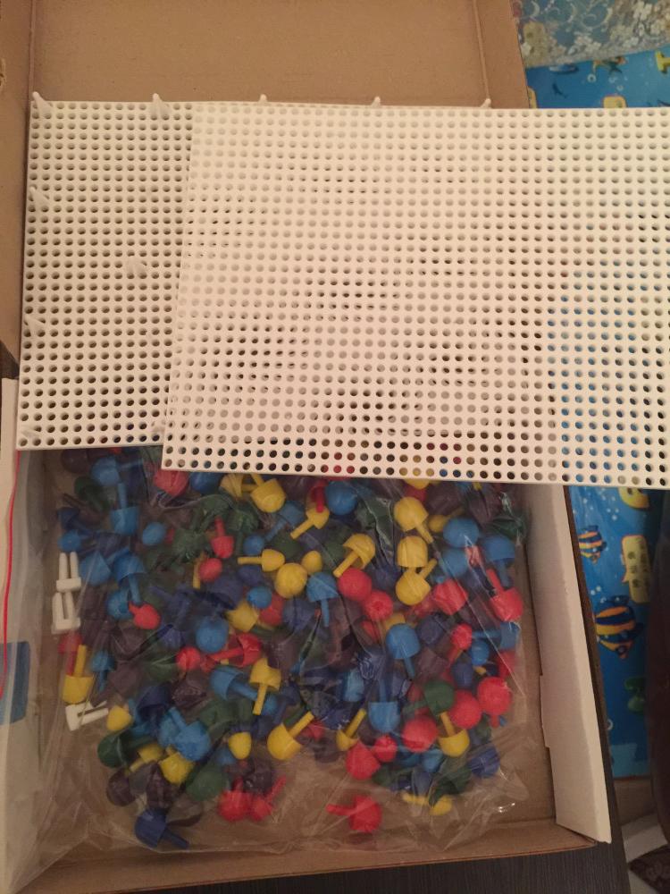Хорошая мозаика, взяла из-за того, что внутри два поля для игры. Удобно у кого двое детей, не будут драться из-за одного поля. Если один ребенок, то поля между собой соединяются и получается одно большое поле. Так же,внутри гвоздики двух размеров. Большие и мелкие для своей цены отличная мозаика.