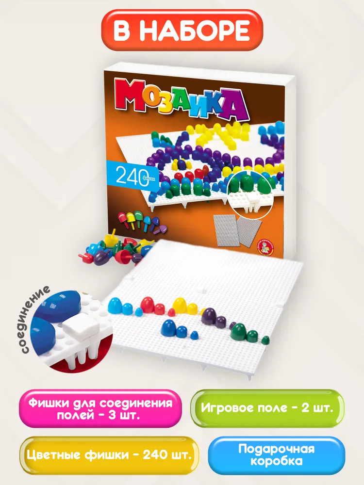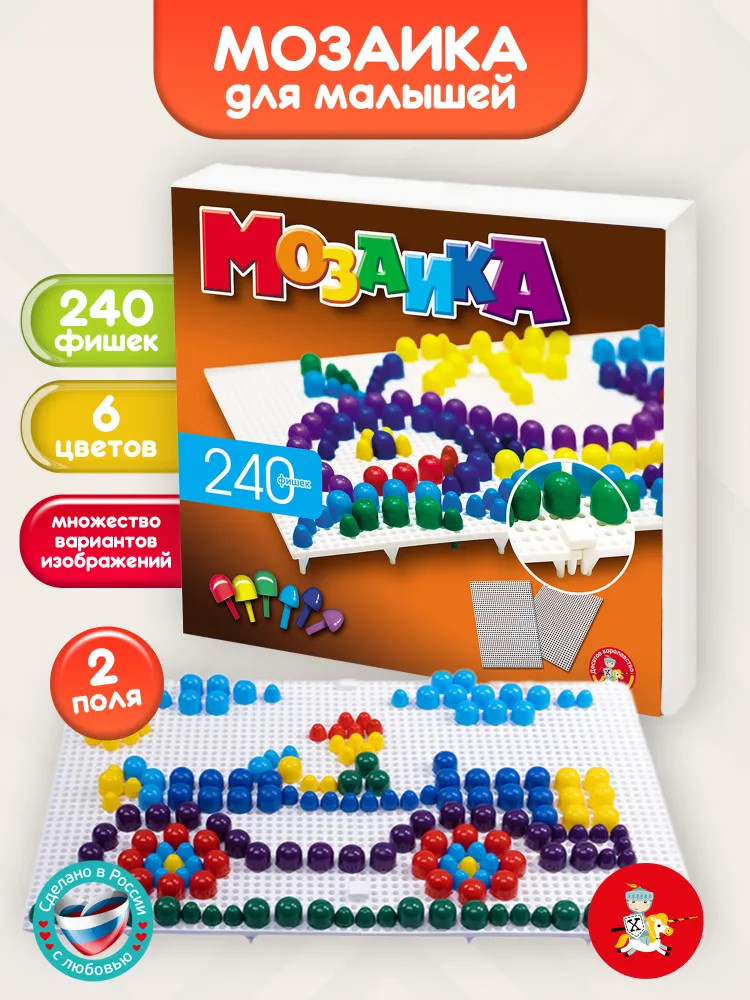 Десятое королевство Мозаика цветная, 240 деталейВ данный момент этот товар отсутствует в продаже. Возможно, у нас найдется аналогичный или похожий товар здесь. Набор для творчества №3 поможет малышам создавать разнообразные мозаики. В наборе есть два поля, в которые предполагается вставлять фишки, составляя из них изображение. Игровые поля можно соединять между собой, чтобы создать одну большую мозаику, а можно использовать их по отдельности для маленьких шедевров. |