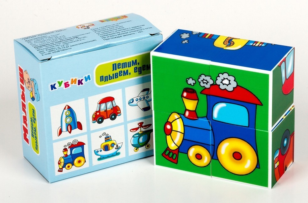 Простые и понятные картинки на кубиках позволяют малышу собрать 6 веселых картинок «Летим, плывем, едем», а именно ракета, автомобиль, самолет, паровозик, кораблик и вертолет.