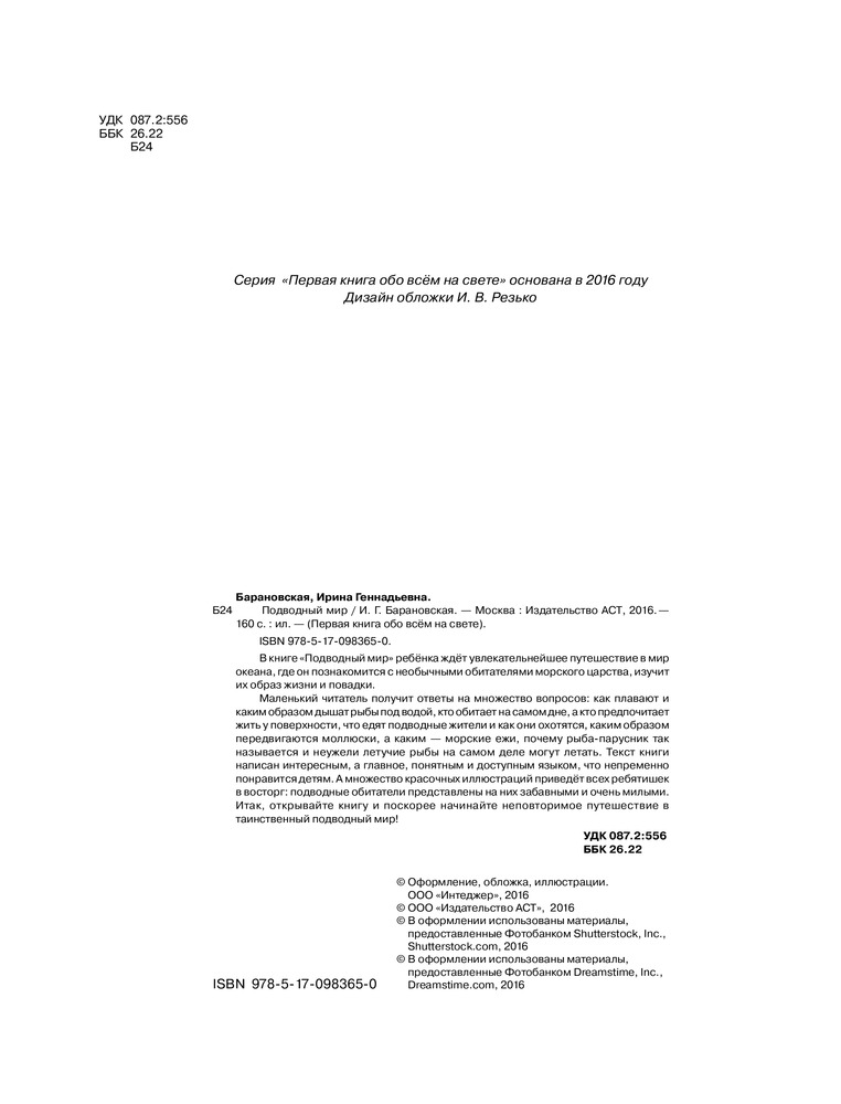 Подводный мирВ данный момент этот товар отсутствует в продаже. Возможно, у нас найдется аналогичный или похожий товар здесь. Серия: Первая книга обо всем на свете Книга «Подводный мир» понравится каждому малышу, ведь она отправит его в увлекательнейшее путешествие в подводный мир, где он познакомится с необычными обитателями морского царства, изучит их образ жизни и повадки. |