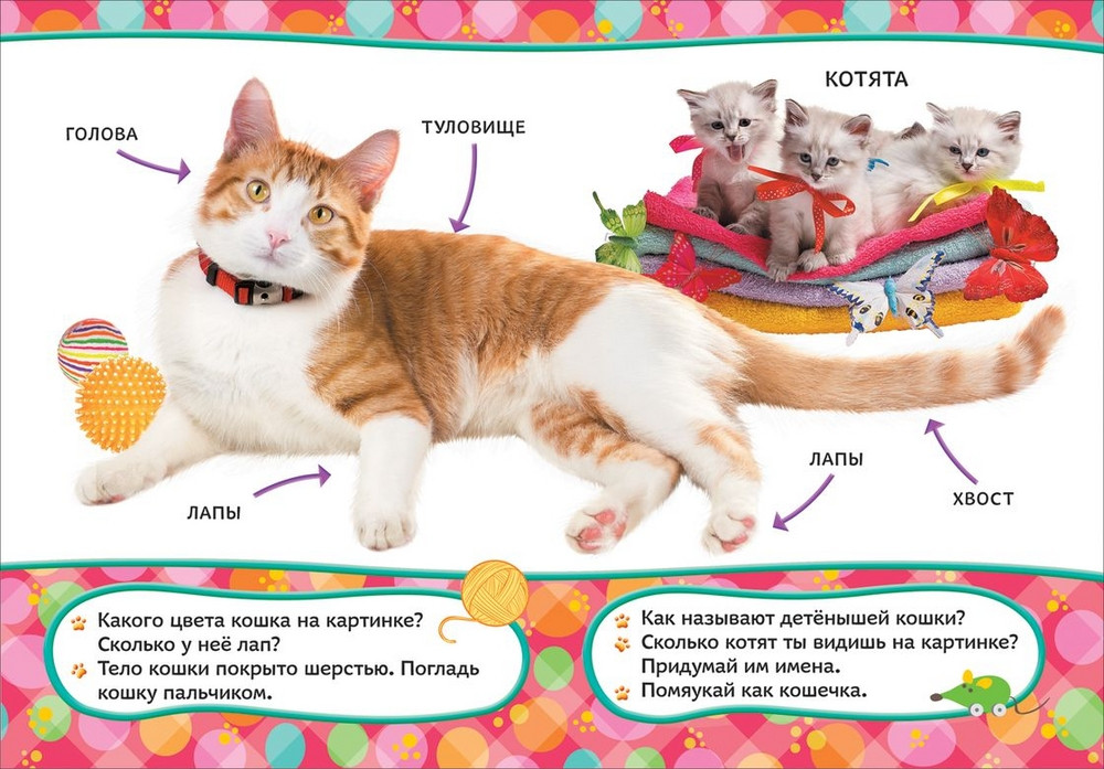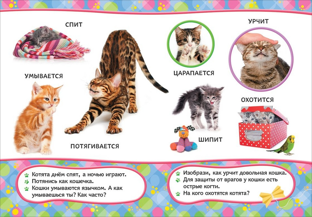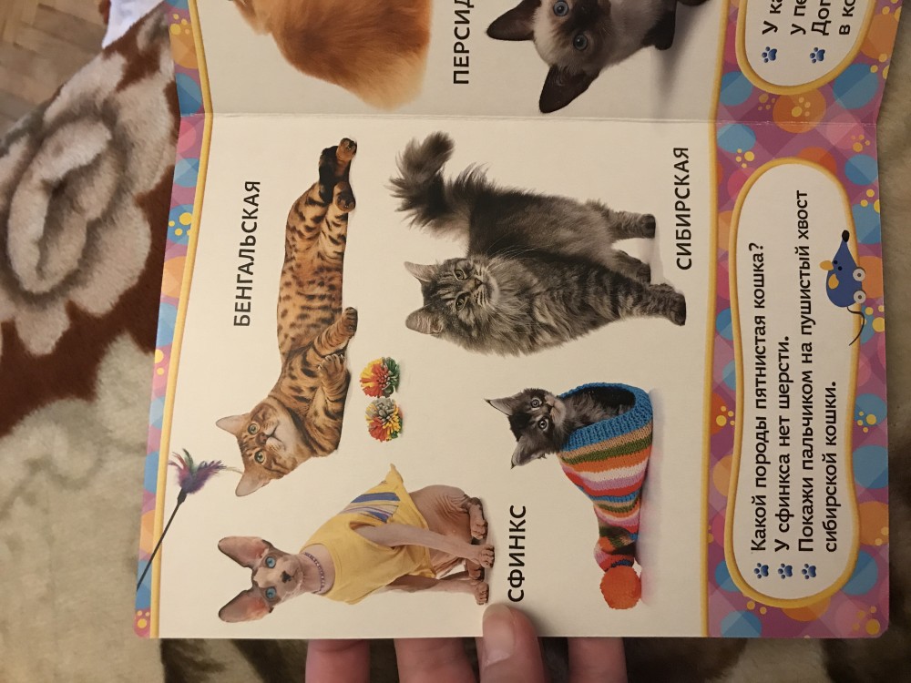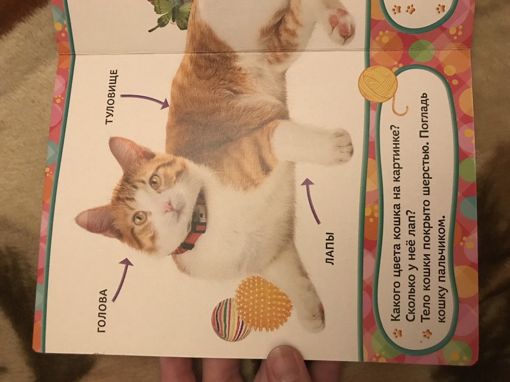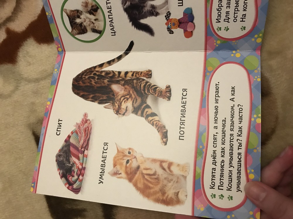 Хорошая книга с твердыми, картонными листами. 4 листа с фотографиями забавных кошек.Снизу задания и вопросы.
