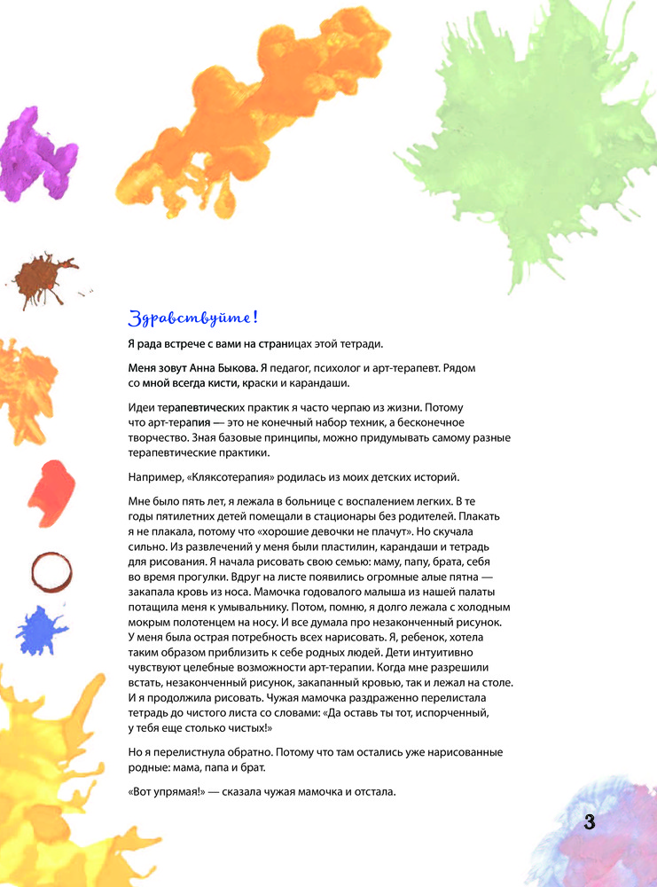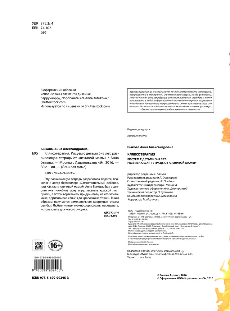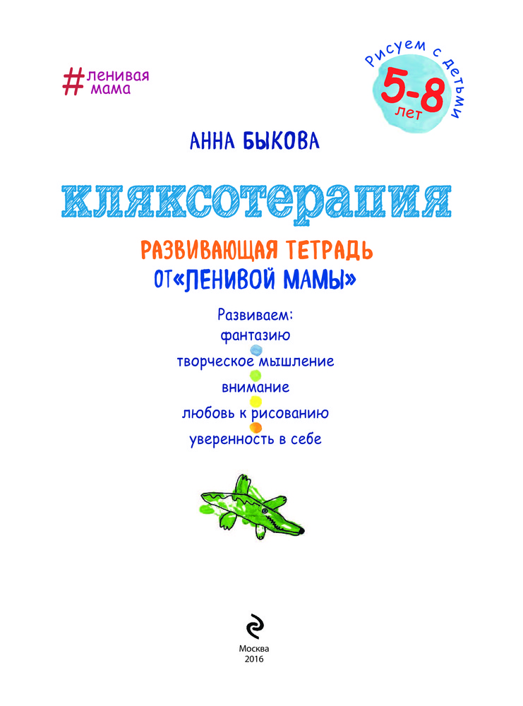 Кляксотерапия. Развивающая тетрадь от "ленивой мамы". Рисуем с детьми 5-8 летВ данный момент этот товар отсутствует в продаже. Возможно, у нас найдется аналогичный или похожий товар здесь. Серия: Ленивая мама Дорогие родители! Эту развивающую тетрадь разработала педагог, психолог и автор бестселлера «Самостоятельный ребёнок, или как стать „ленивой мамой“», Анна Быкова. Еще в детстве она полюбила одну игру: закапать краской лист бумаги, а потом вертеть его, придумывать, на что это похоже, дорисовывая кляксы до красивой картинки. Таким образом получается замечательная коррекция страха ошибки. Любые «ляпы» можно дорисовать, переделать, использовать для нового рисунка. |