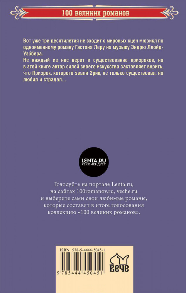 Призрак ОперыВ данный момент этот товар отсутствует в продаже. Возможно, у нас найдется аналогичный или похожий товар здесь. Серия: 100 великих романов Вот уже три десятилетия не сходит с мировых сцен мюзикл по одноименному роману Гастона Леру на музыку Эндрю Ллойд-Уэббера. |