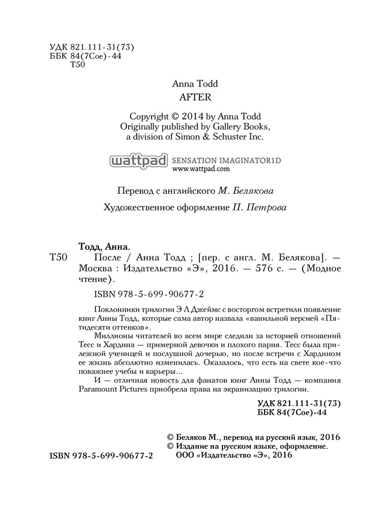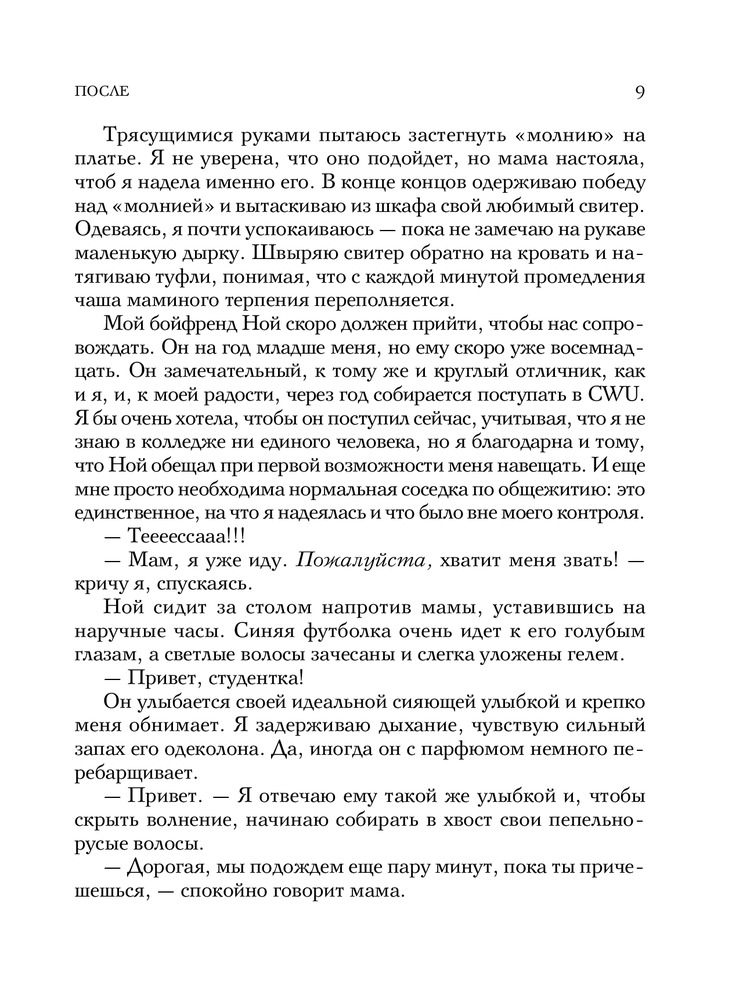 ПослеВ данный момент этот товар отсутствует в продаже. Возможно, у нас найдется аналогичный или похожий товар здесь. Серия: Модное чтение. Проза Анны Тодд Миллион читателей во всем мире следили за историей отношений Тесс и Хардина — примерной девочки и плохого парня. Тесс была прилежной ученицей и послушной дочерью, но после встречи с Хардином ее жизнь абсолютно изменилась. Оказалось, что есть на свете кое-что поважнее учебы и карьеры... |