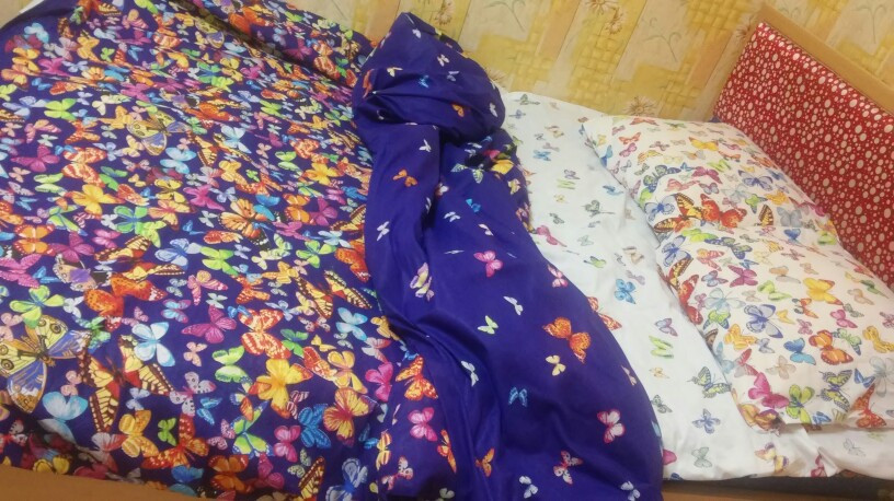 Красивый комплект. Бабочки (каждая) разноцветные яркие с четкими контурами. Пользуемся неделю 2 х спальным евро все замечательно. Всего купили 3 одинаковой расцветки 1.5 , евро и семейный для всей семьи. Очень всем бабочки понравились. Спасибо!