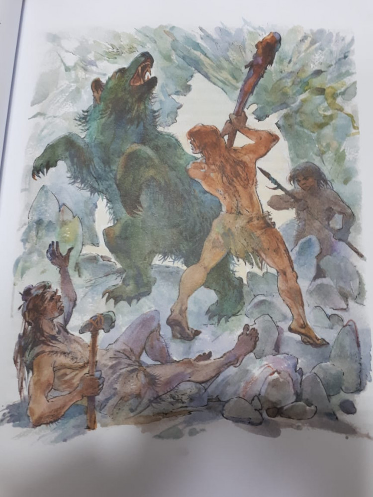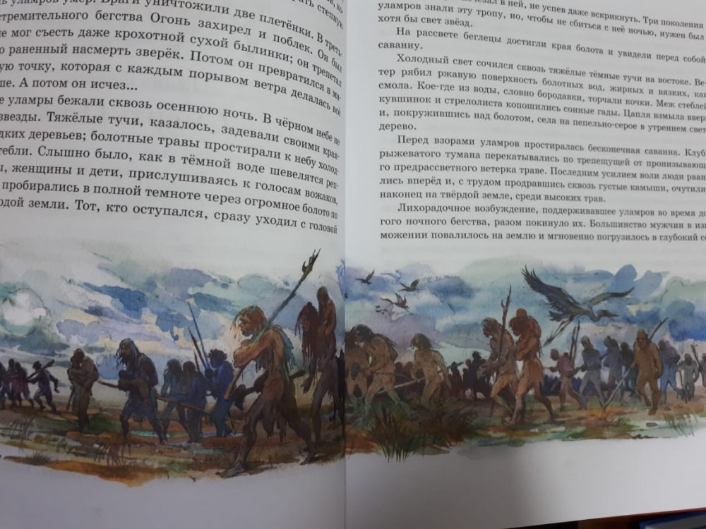 Эта книга - одно из любимейших моих с детства произведений, перечитанных не раз и в зрелые годы. завораживала и сама история, и мастерский слог, и описания дикой природы, сражений и схваток доисторического периода. Однако в той книге совсем не было картинок, и образы героев - людей и животных, рисовало только воображение. Поэтому,прочитав в отзывах про отличные иллюстрации, без раздумий приобрела книгу для внука и была несколько разочарована. Во-первых, книга издана не в любимом, памятном каждым словом великолепнейшем переводе А.Вейнрауба, а в переводе И. Орловской, может, и неплохом, но, на мой взгляд, менее образном и совершенном. Но это - дело личного предпочтения. Хуже обстоит дело с иллюстрациями. Художник не смог передать атмосферу величественной природы первобытного мира, роскошным описаниям которого у Рони Старшего уделено так много места в книге! Они грубоваты, а главное, в них нет того духа приключений и высокого героизма, которым пропитана вся история! Нао и его товарищи выглядят, как банальные "троглодиты" из учебника истории 50-х годов прошлого века, а совсем не как героические личности! Нет ни одной достойной панорамы животного мира или охот, погонь, сражений, которых в книге множество, и описаны они весьма впечатляюще! Доисторические животные художником нарисованы довольно примитивно, без знания их повадок и с нарушением анатомии. А люди? На мой взгляд, автор рисунков уж слишком старается подчеркнуть их "недосапиенсность": низкие лбы, тяжёлые надбровные дуги и общую грубость облика. Особенно ужасает Гаммла - то ли мужик, то ли девушка лет сорока. А ведь современными антропологами уже доказано, что человек разумный, к виду которого явно (по образу мысли и поступкам, да и по закону литературного жанра)принадлежат Нао и его товарищи, и в древности внешне не слишком отичался от нас. То же можно сказать и о неандертальцах. Они - люди с живым умом, не чуждые любви, дружбы, сострадания. Даже Аго способен на братские чувства! В общем, не так, на мой взгляд, должны выглядеть иллюстрации к этой книге. Хотя читать, конечно, можно. Судите сами. Фото некоторых прилагаю.