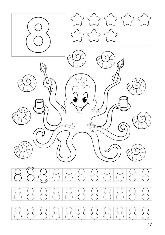 Отличная пропись для 4-5 лет. Вверху надо раскрасить цифру и рисунок. Внизу эту цифру прописать по точкам. Рекомендую.