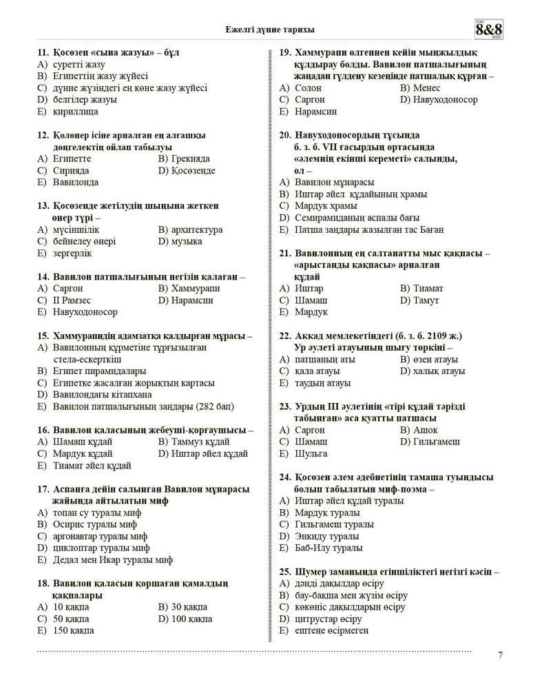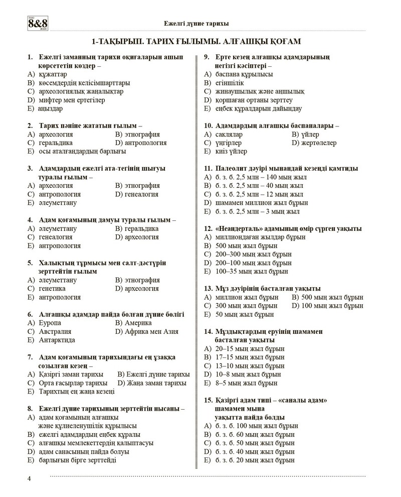 Бұл құралдар топтамасында мектеп бағдарламасында көзделген ежелгі заманнан ХХІ ғасырдың бас кезіне дейінгі дүниежүзі тарихының барлық кезеңдері ашып көрсетілген. Әрбірінде 25–50 сұрақтан бар 53 тақырыпқа біріктірілген 1700 тест тапсырмасы қамтылған. Материалдарды жинақтау барысында Білім беру мен тестілеудің МСҰО 2008–2010 жылдары шығарған «Дүниежүзі тарихы бойынша тест тапсырмаларының жинақтарына» талдау жасалды. Талдау жұмыстары жоғарыда аталған жинақтардағы тест тапсырмалары Қазақстан Республикасы Білім және ғылым министрлігінің жалпы білім беретін мектептер үшін ұсынылған оқулықтардың шегінен шығып кететінін көрсетті.