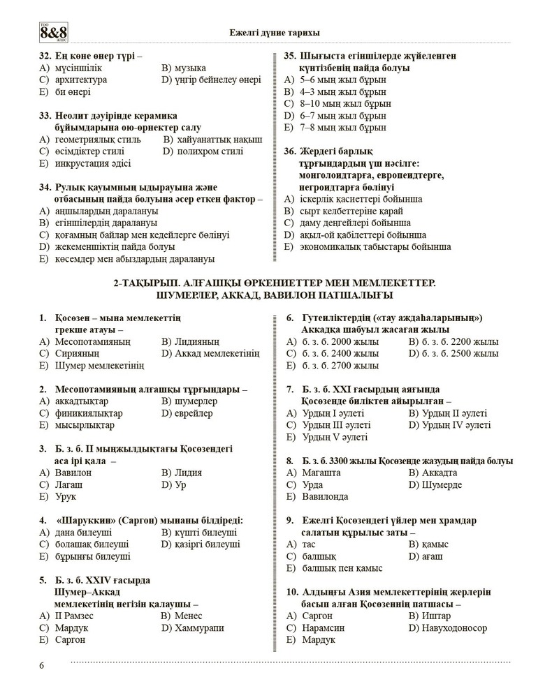 Тест тапсырмаларының жинағы. 6 сынып. Ежелгі дүние тарихы.