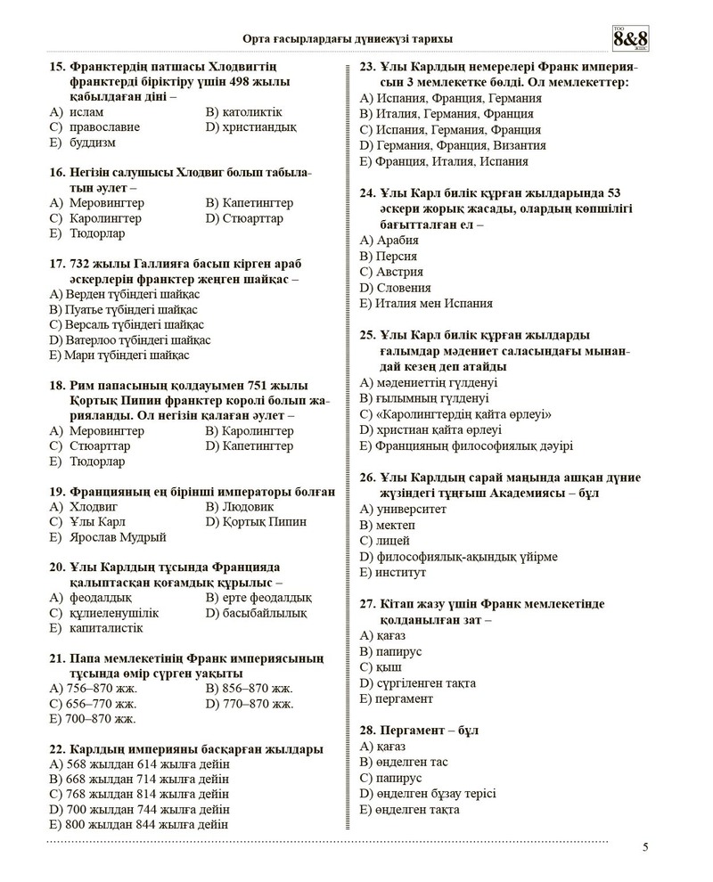 Тест тапсырмаларының жинағы. Орта ғасырлардағы дүниежүзі тарихы. 7 сынып.